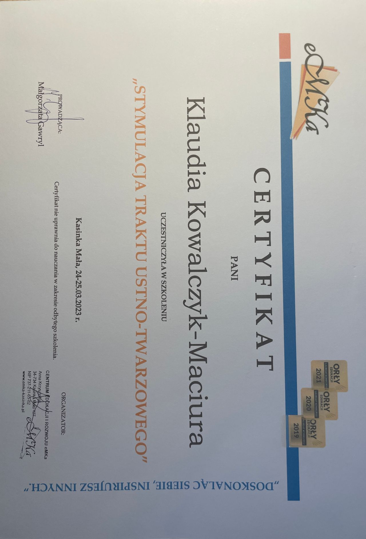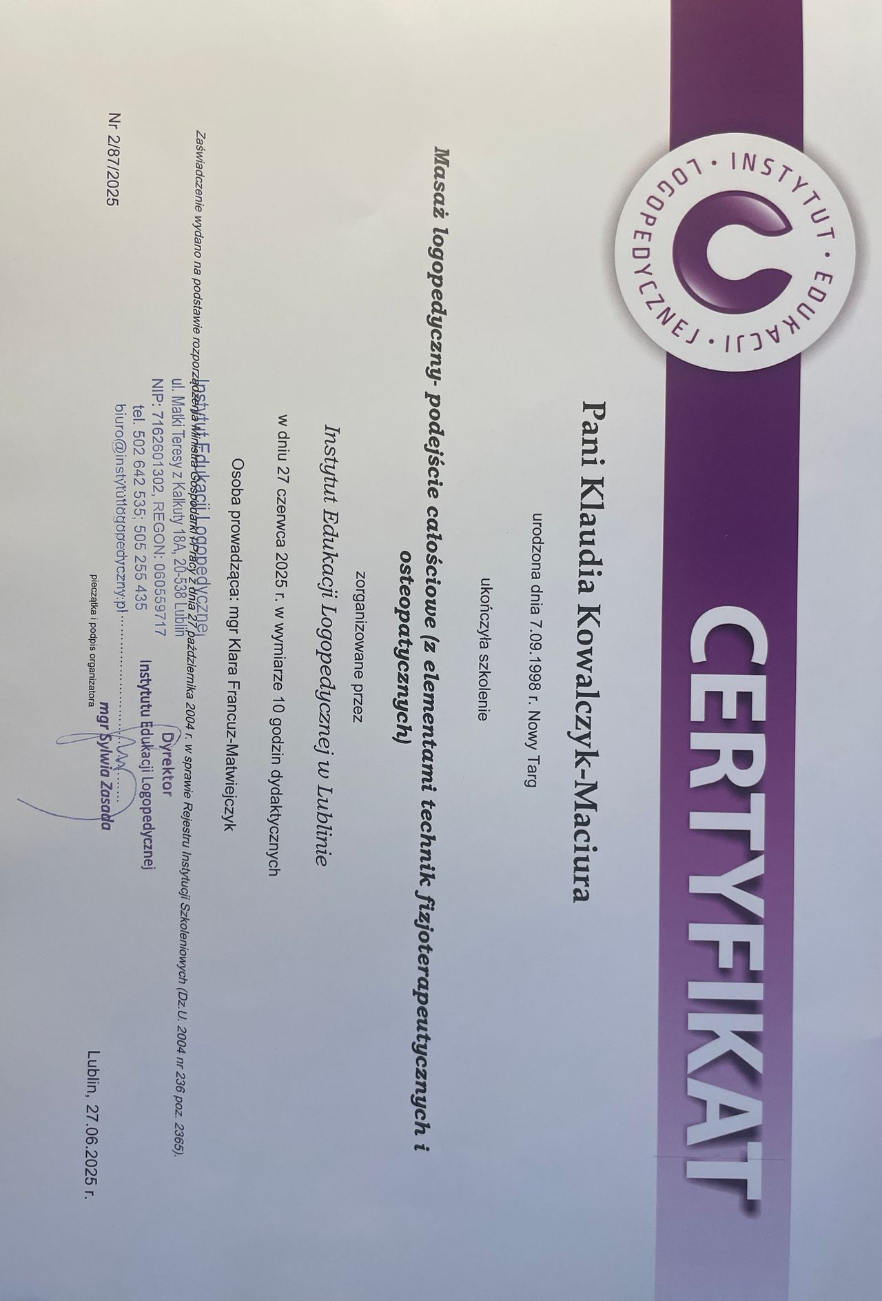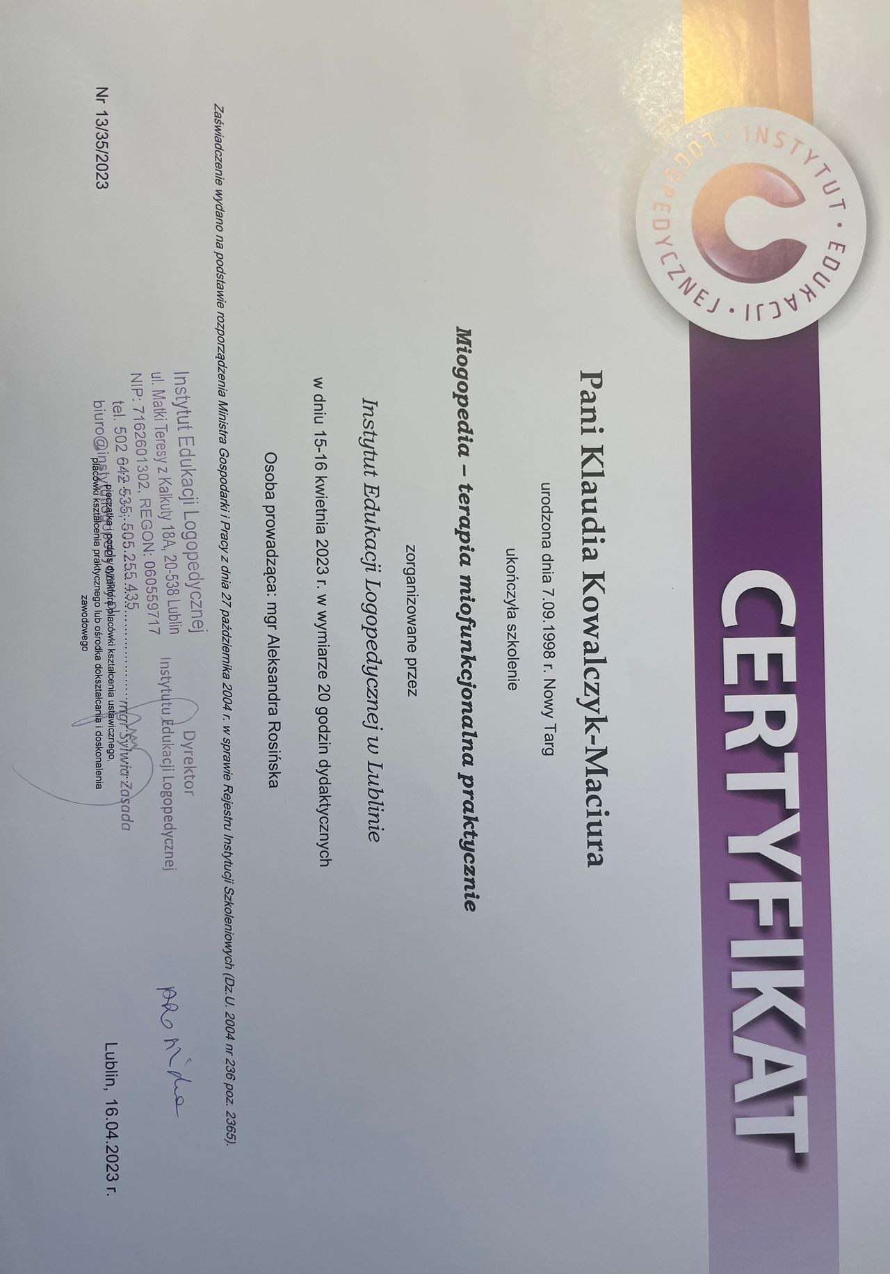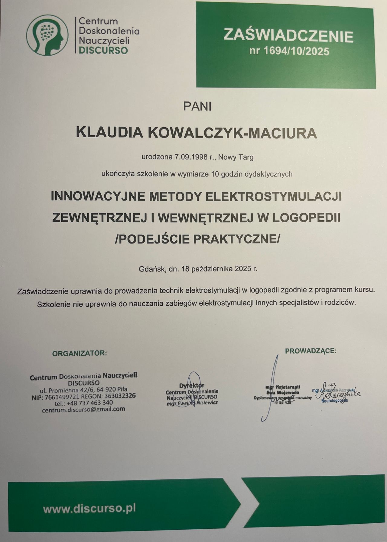 Ukończyłam logopedię na Akademi Ignatianum w Krakowie. Jestem certyfikowaną terapeutką elektrostymulacji w logopedii, uczestniczyłam w szkoleniach w zakresie terapii miofunkcjonalnej, opóźnienia rozwoju mowy. Zajmuję się pracą terapeutyczną z dziećmi od 3 r.ż, młodzieżą oraz osobami dorosłymi.