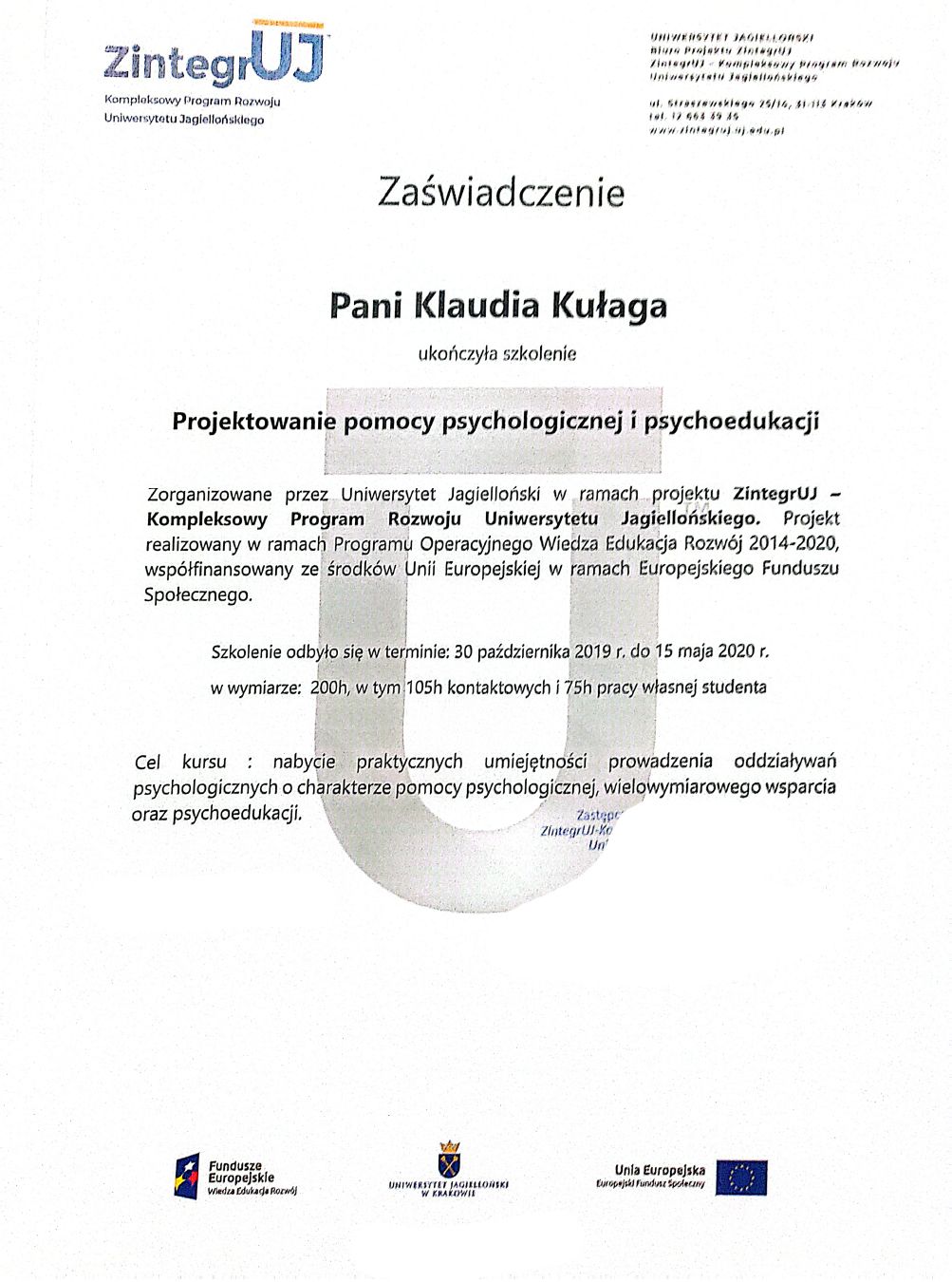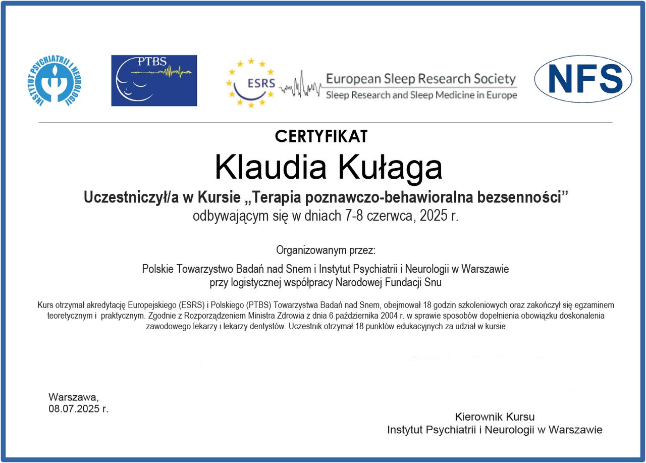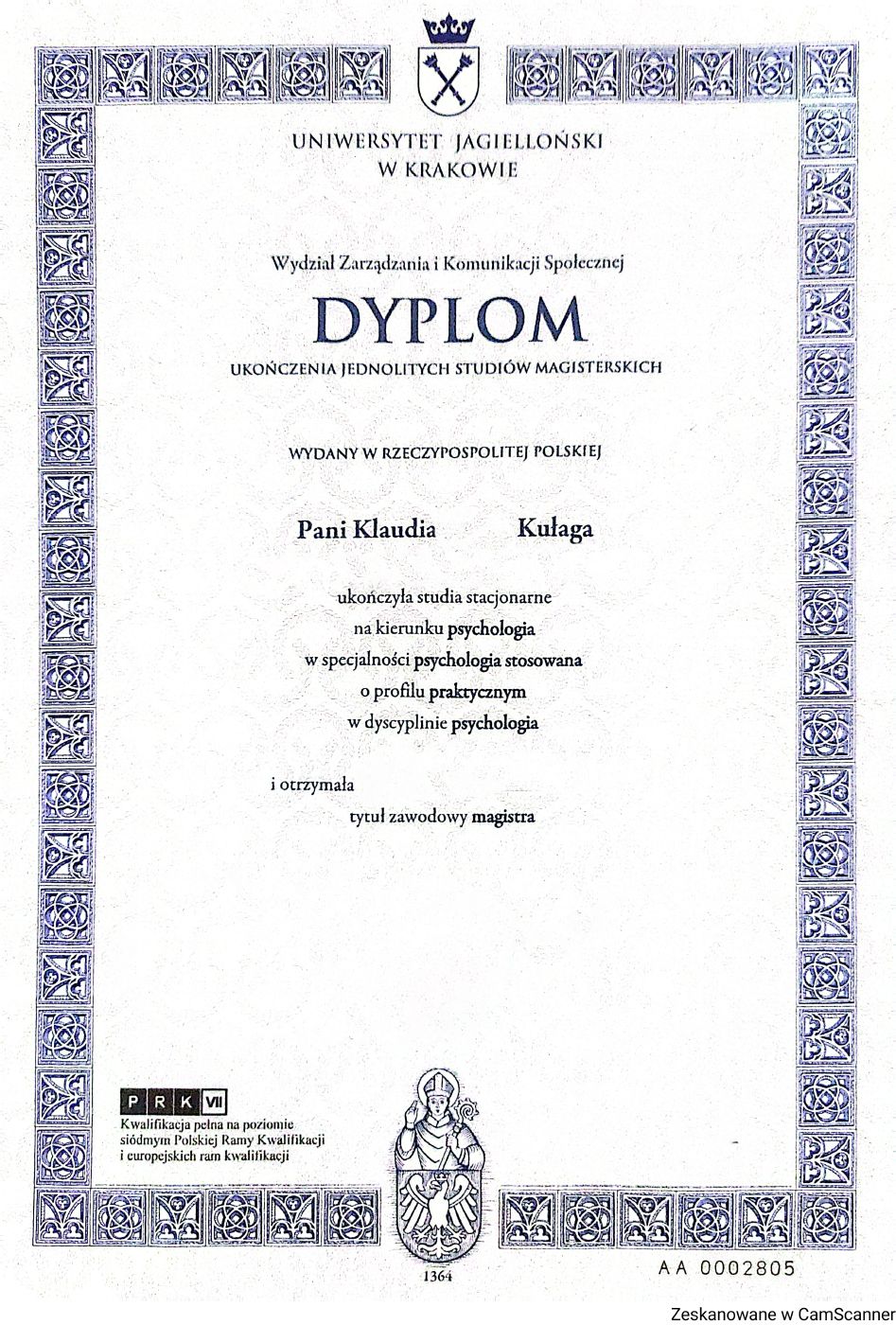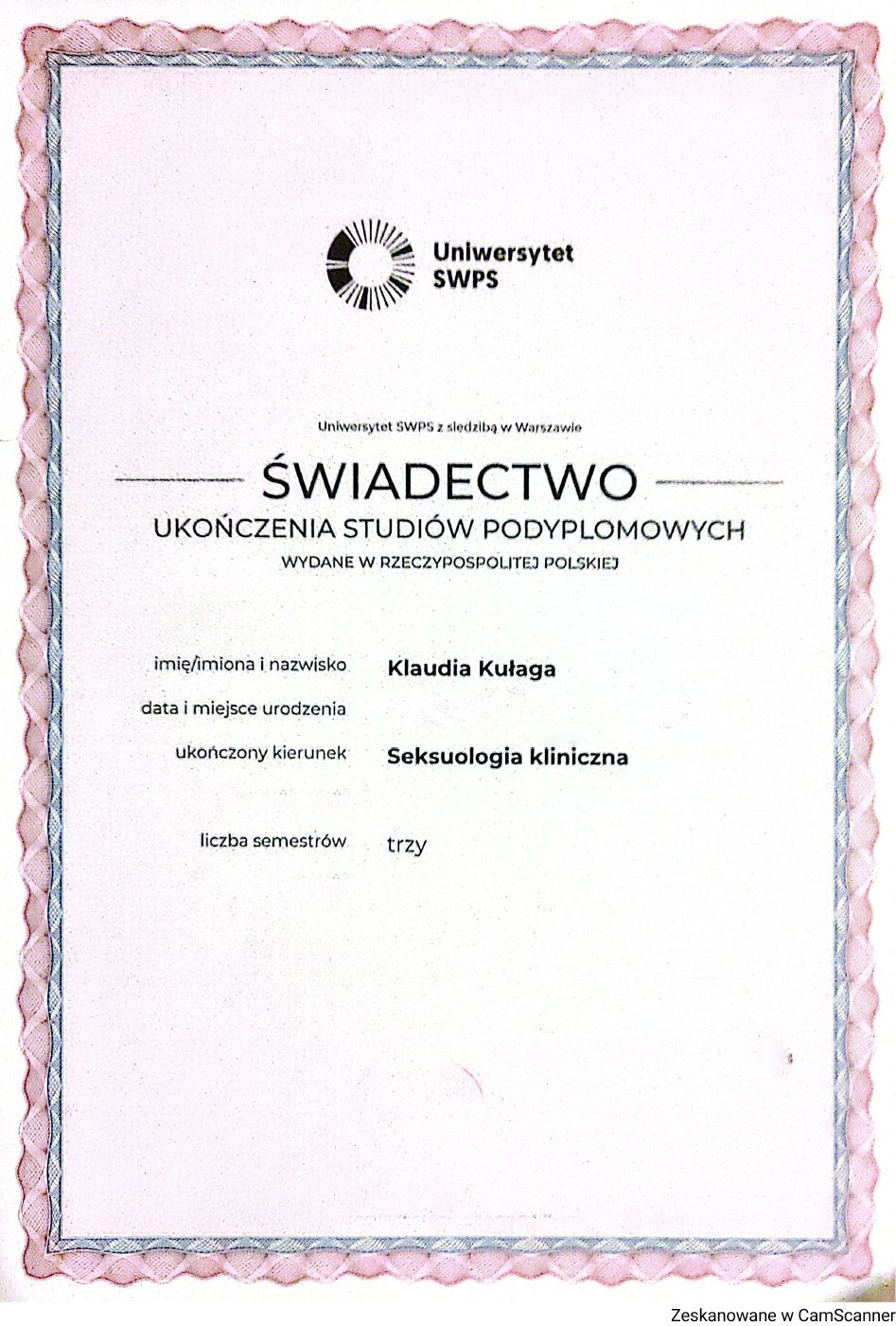 Ukończyłam psychologię stosowaną na Uniwersytecie Jagiellońskim w Krakowie oraz studia podyplomowe z seksuologii klinicznej na Uniwersytecie SWPS w Katowicach. Obecnie jestem w trakcie Szkoły Terapii Poznawczo-Behawioralnej SWPS. Swoją pracę poddaję regularnej superwizji oraz jestem członkinią Polskiego Towarzystwa Terapii Poznawczej i Behawioralnej.
