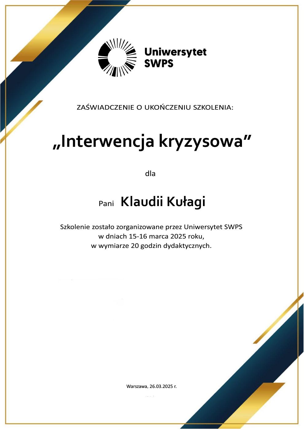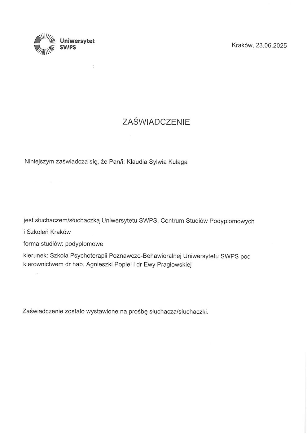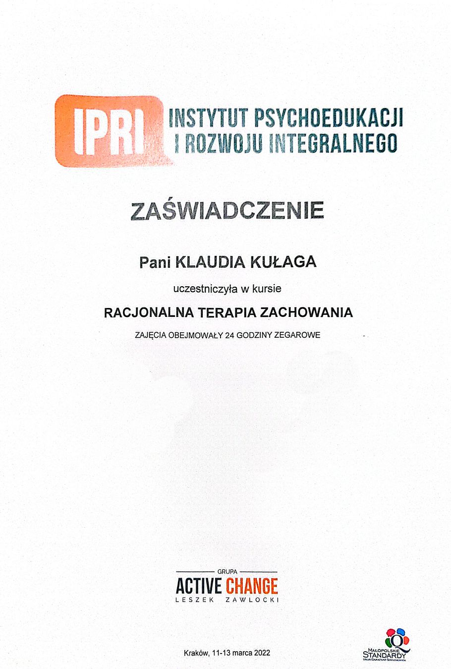 Ukończyłam psychologię stosowaną na Uniwersytecie Jagiellońskim w Krakowie oraz studia podyplomowe z seksuologii klinicznej na Uniwersytecie SWPS w Katowicach. Obecnie jestem w trakcie Szkoły Terapii Poznawczo-Behawioralnej SWPS. Swoją pracę poddaję regularnej superwizji oraz jestem członkinią Polskiego Towarzystwa Terapii Poznawczej i Behawioralnej.