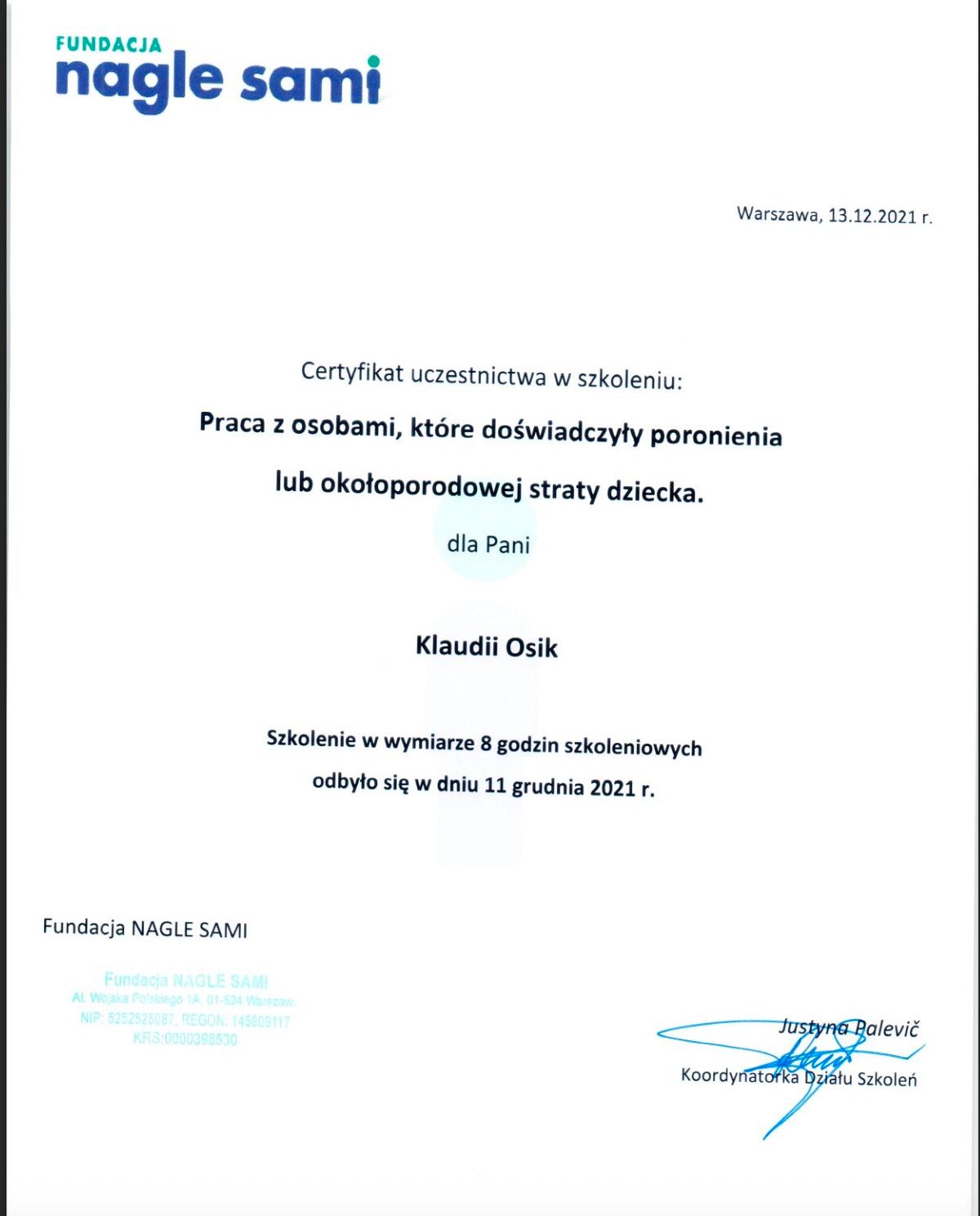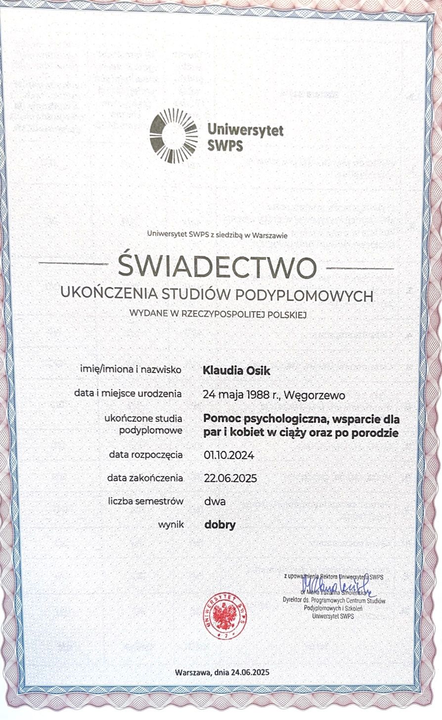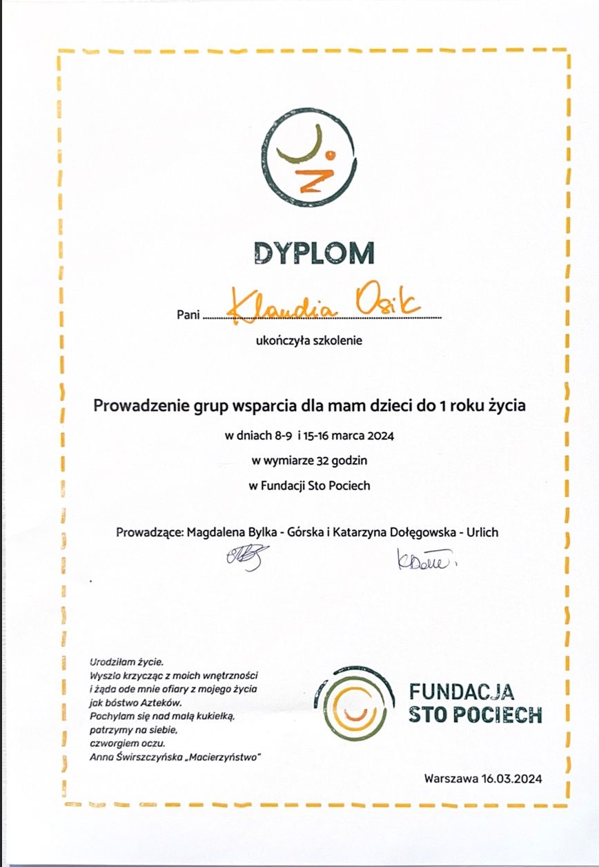 Pod skrzydła Pani Klaudii trafiłam będąc w 8 miesiącu ciąży, z totalnym rozchwianiem emocjonalnym i poczuciem bezradności. Po kilku spotkaniach, dzięki wspaniałemu i profesjonalnemu wsparciu Pani Klaudii odnalazłam tak bardzo ważny dla mnie spokój i motywację. Serdecznie polecam współpracę z Panią Klaudia.