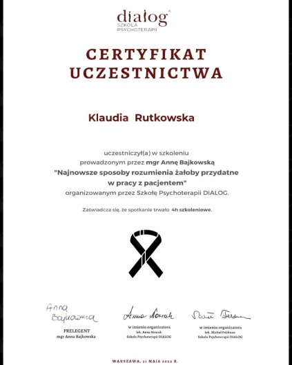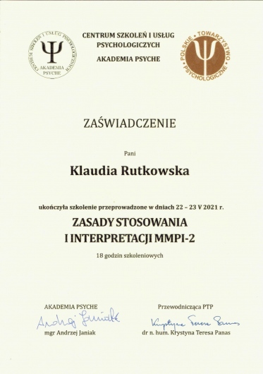Stale rozwijam swoje kompetencje zawodowe – ukończyłam m.in. szkolenie z zasad stosowania i interpretacji MMPI-2 (Minnesocki Wielowymiarowy Inwentarz Osobowości®-2) oraz szkolenie podstawowe z terapii EMDR (poziom 1), stosowanej m.in. w pracy z traumą.