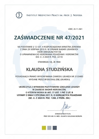 Jestem specjalistą medycyny rodzinnej oraz posiadam uprawnienia do badań lekarskich osób ubiegających się o uzyskanie uprawnień do kierowania pojazdami i kierowców.