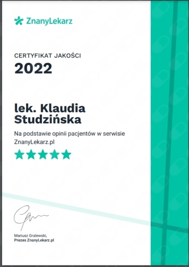Jak Klaudia Studzińska umawia wizyty?Klaudia Studzińska używa kalendarza ZnanyLekarz, dlatego na stronie widzisz aktualne terminy. Wystarczy, że wybierzesz datę i godzinę, które odpowiadają Ci najbardziej. Umawianie wizyty jest darmowe, a tuż przed terminem wyślemy Ci przypomnienie.