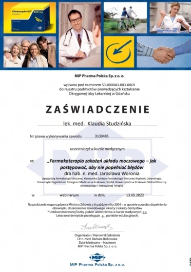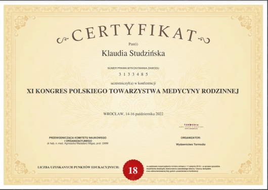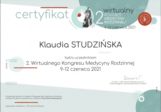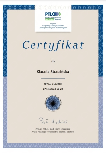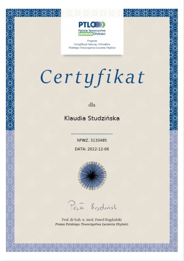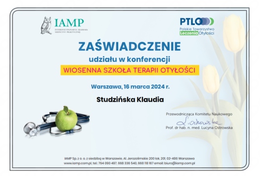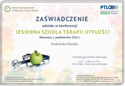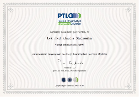 Wzięłam również udział w Ogólnopolskim Programie Certyfikacji i Akredytacji prowadzonym przez Polskie Towarzystwo Badań nad Otyłością oraz jestem członkiem Polskiego Towarzystwa Leczenia Otyłości – prowadzę farmakologiczne leczenie nadwagi i otyłości.