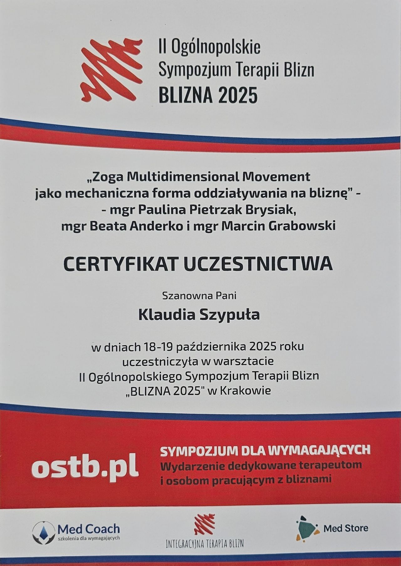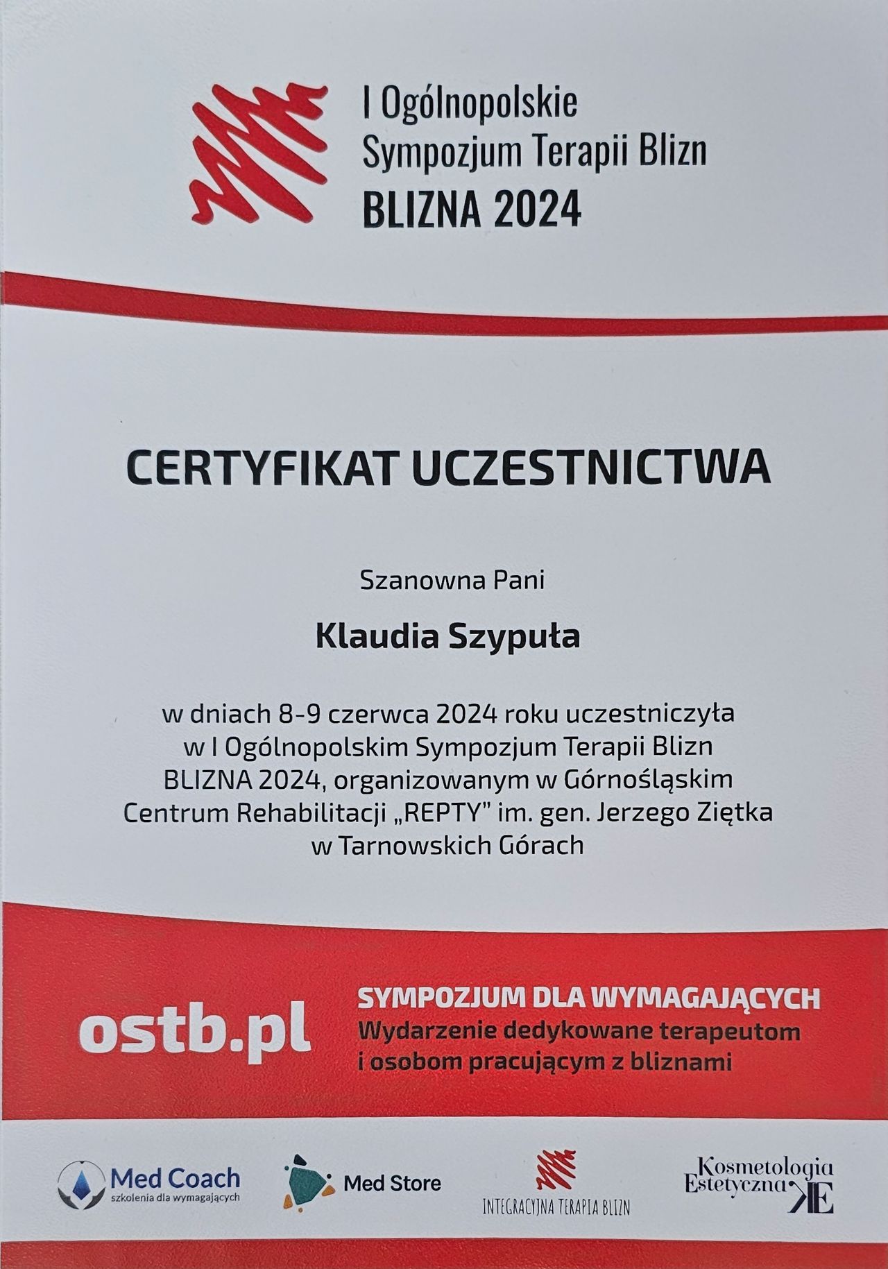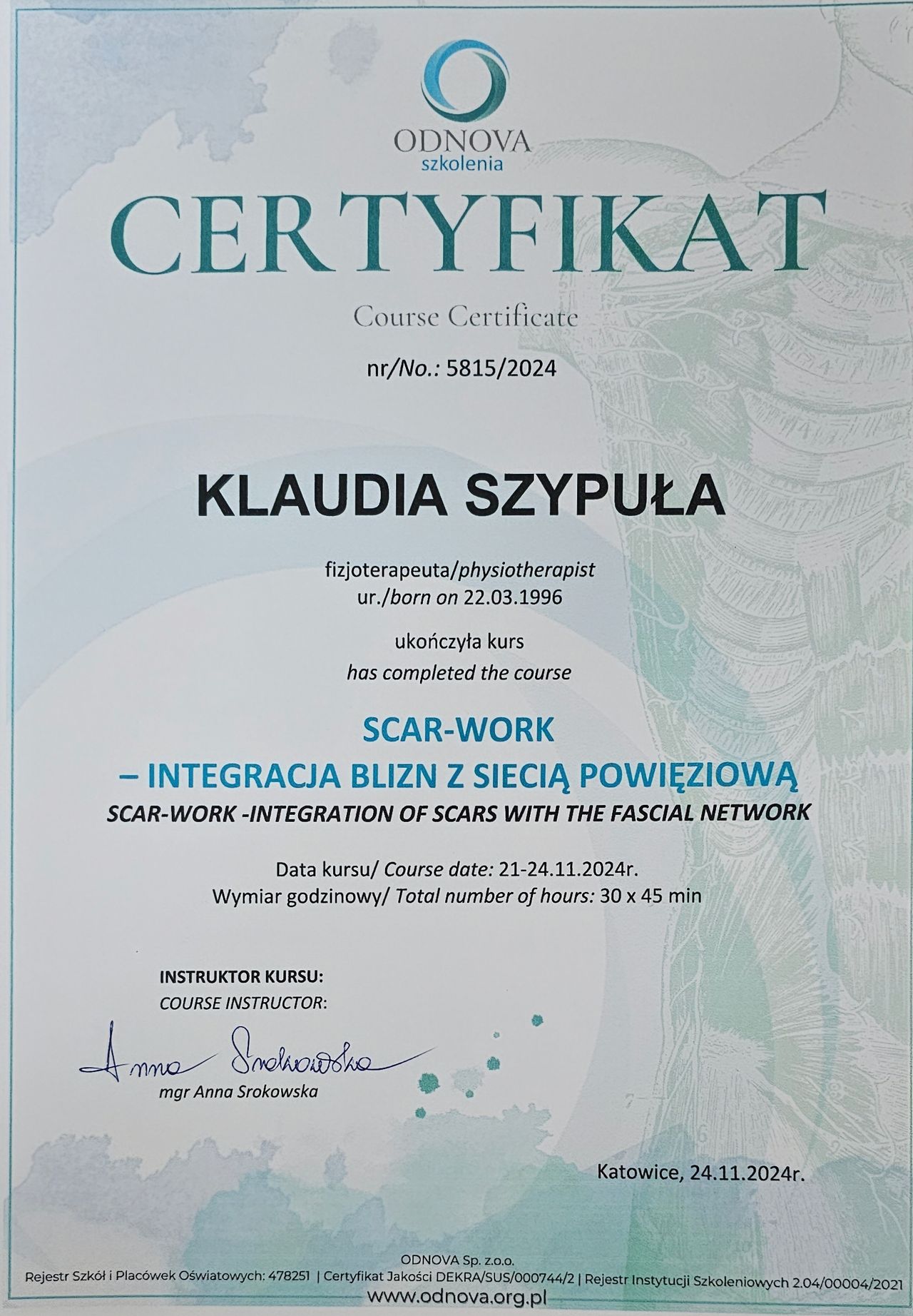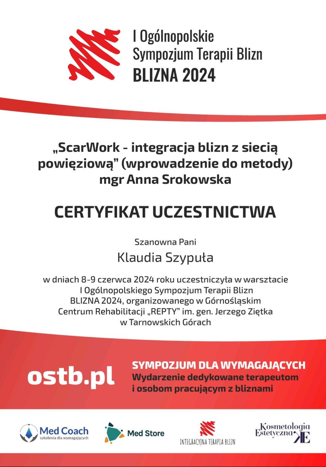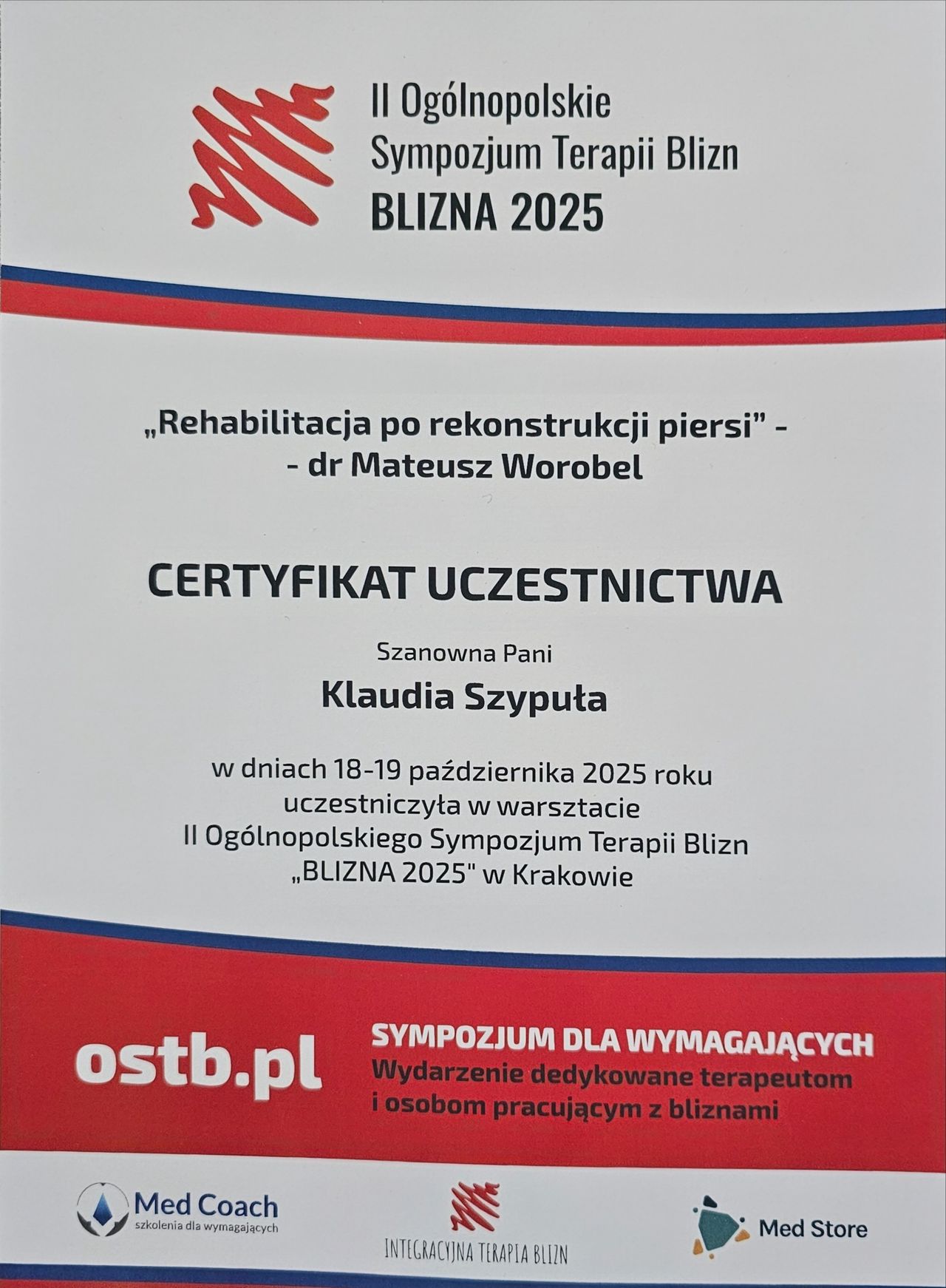 Jestem pod ogromnym wrażeniem profesjonalizmu i wiedzy Pani Klaudii. Szczegółowo wyjaśniła jak będzie przebiegał proces terapii blizn, dobrała odpowiednie zabiegi dzięki czemu blizna od pierwszej wizyty była mniej sztywna i zwiększył mi się zakres ruchu. Z całego serca polecam każdej osobie, która zmaga się z dolegliwościami takimi jak ciągniecie blizny.