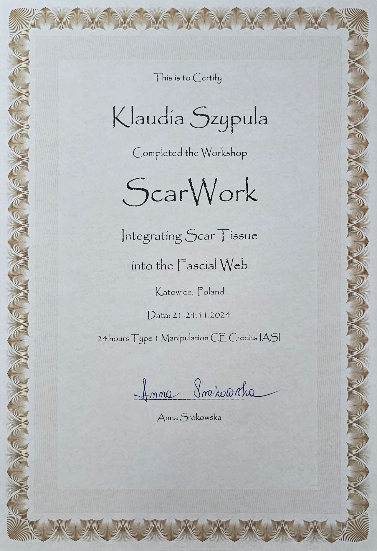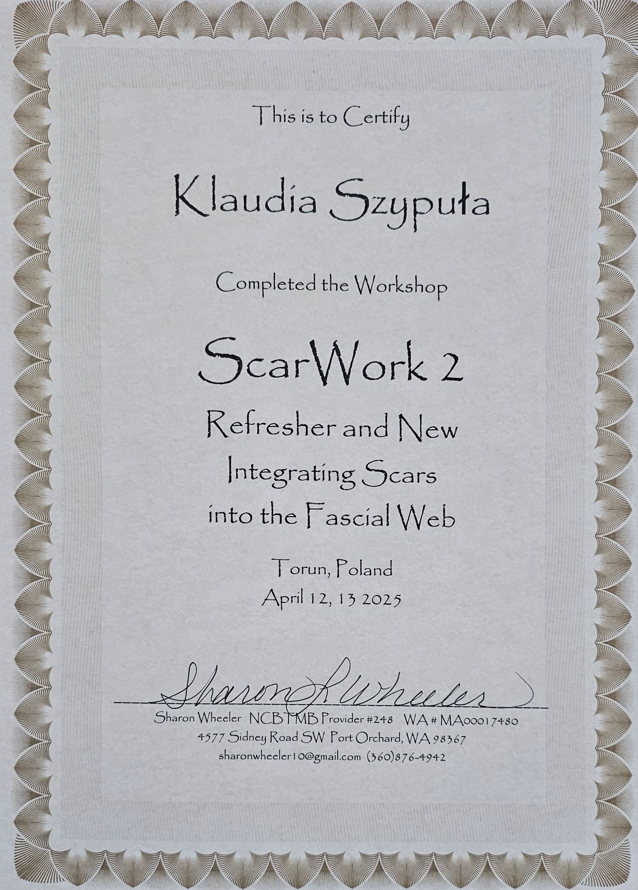W praktyce fizjoterapeutycznej niezwykle cenię sobie indywidualne i holistyczne podejście do Pacjenta. Ufam, że kluczem jest szczegółowy wywiad i dokładne badanie. Łączę różnorodne techniki pracy - od klasycznych metod takich tak terapia manualna wg Kaltenborna po suche igłowanie czy pinoterapię. W pracy z bliznami pooperacyjnymi dostosowuję technikę indywidualnie, jednak szczególnie bliska jest mi koncepcja ScarWorku, w której kluczem jest zintegrowanie blizny z siecią powięziową.