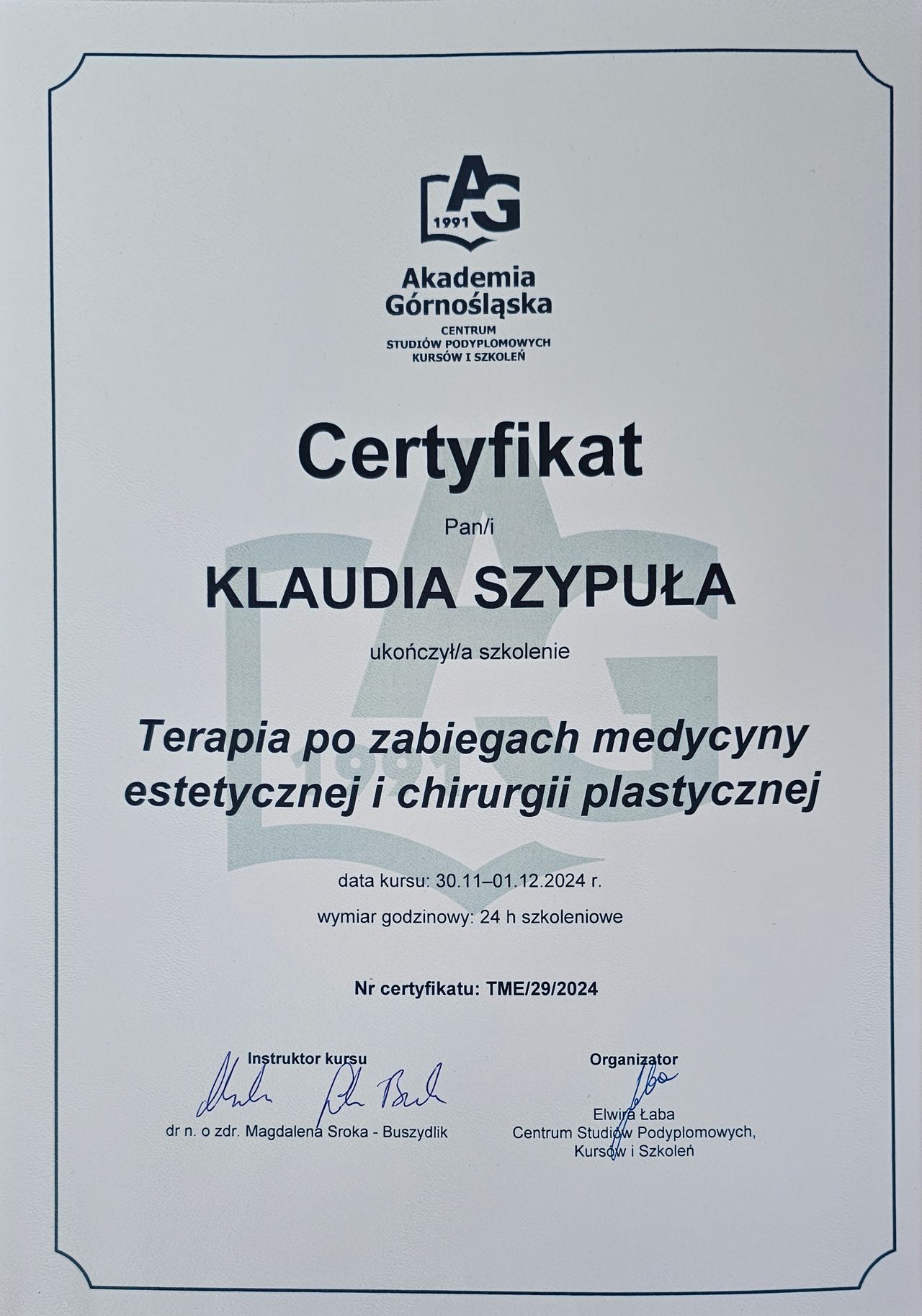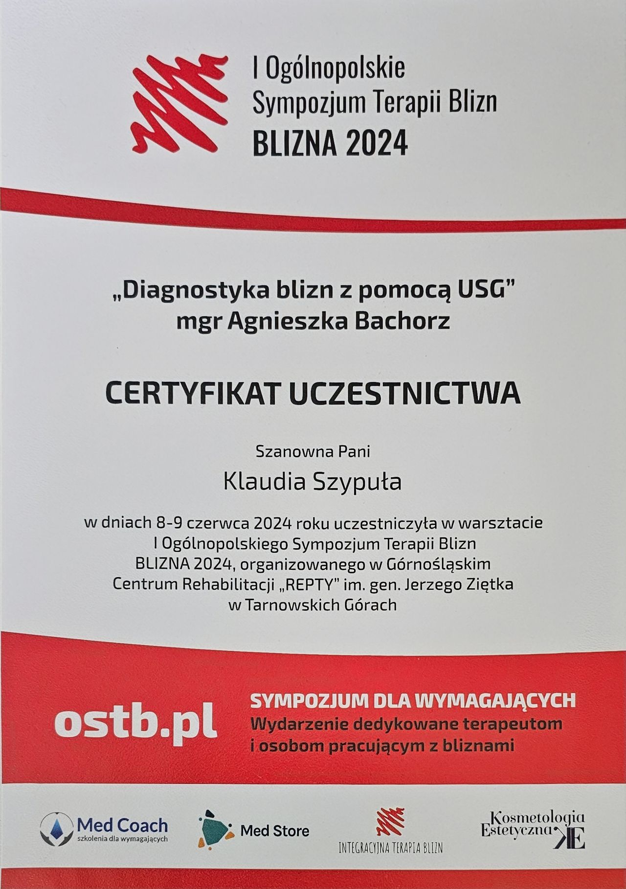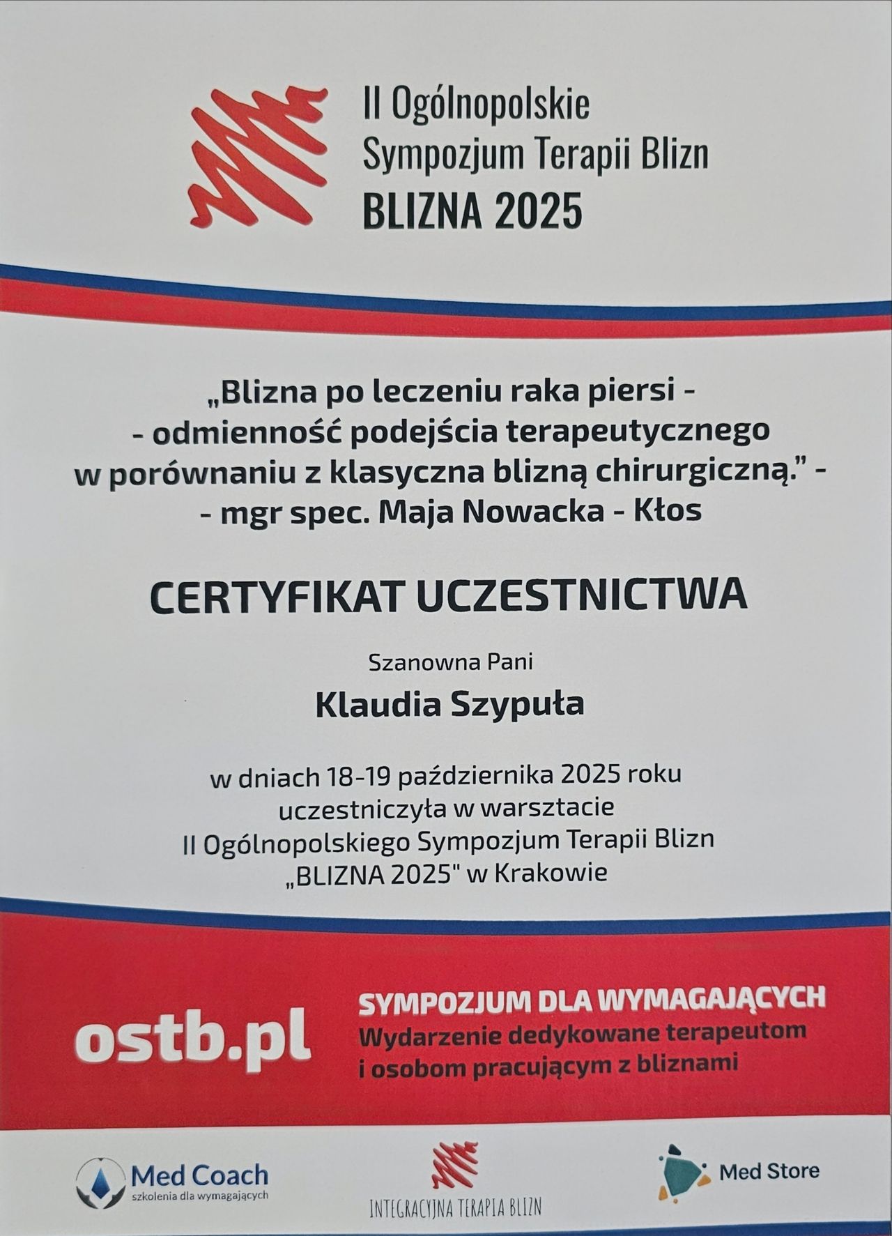 Zdecydowanie polecam Klaudię każdemu, kto potrzebuje wsparcia po operacji i chce zadbać o swoje zdrowie oraz wygląd blizny. To specjalistka z pasją, wiedzą i sercem do pacjenta – najlepsza w swojej dziedzinie• Centrum Medyczne YOU CLINIC • terapia blizn •