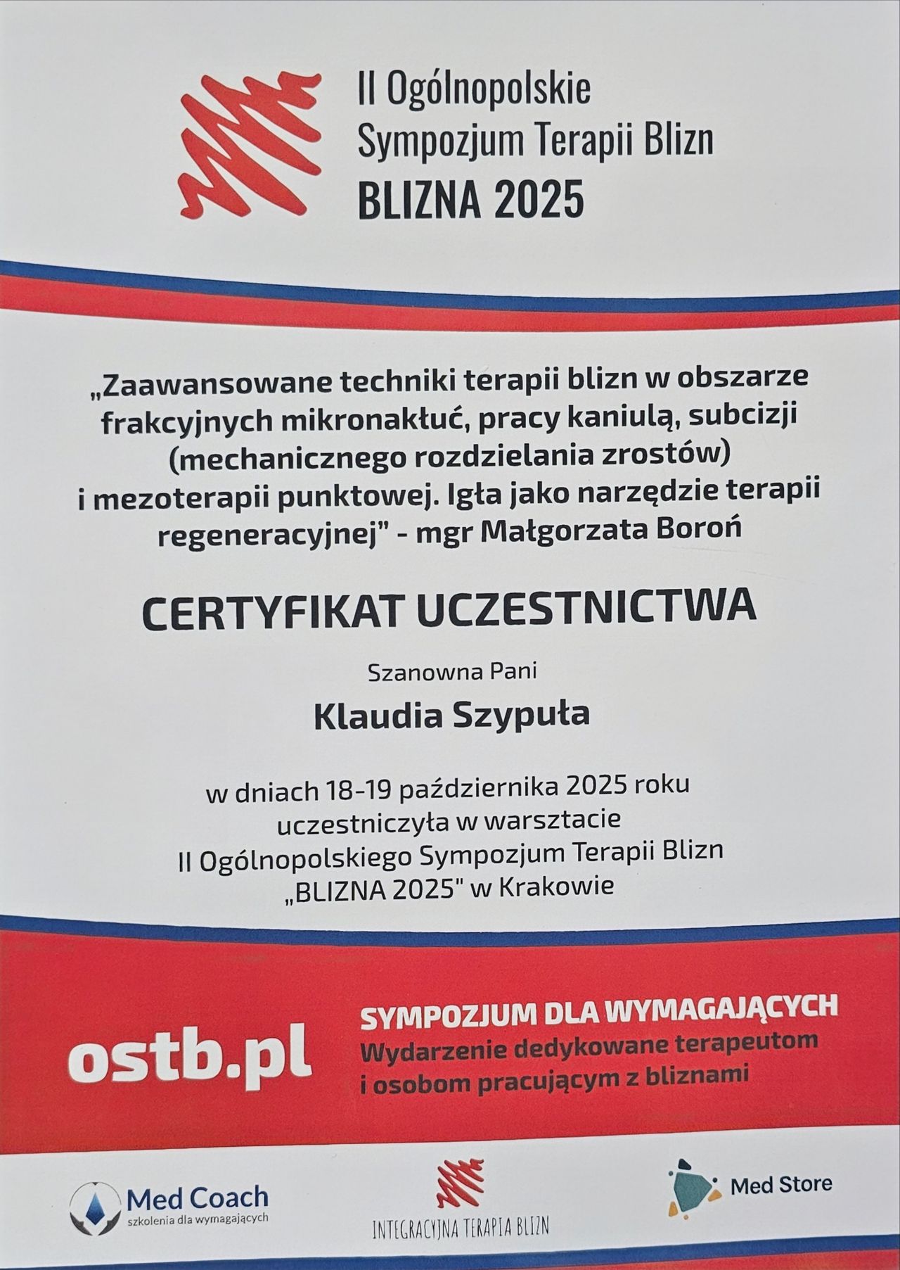 Miałam wielkie szczęście, że ze swoją blizną po operacji trafiłam do Klaudii. Już podczas pierwszej rozmowy zauważyłam, że to osoba, która kocha swoją pracę, a blizny są jej „zajawką”. Od razu poczułam, że jestem w dobrych rękach! Efekty terapii przerosły moje oczekiwania – bardzo szybko zauważyłam wyraźną poprawę wyglądu i elastyczności blizny.