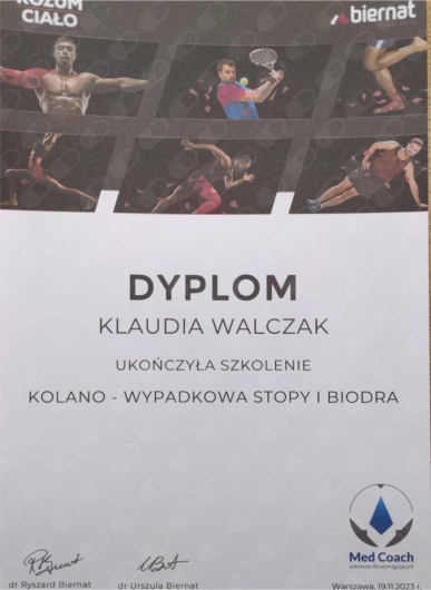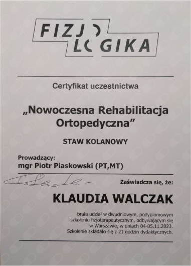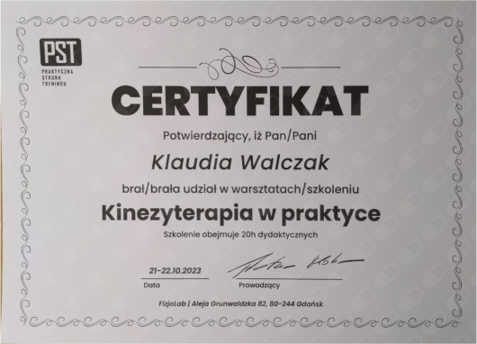 Mam na imię Klaudia i jestem mgr. Fizjoterapii, absolwentką Uniwersytetu Medycznego w Łodzi, Certyfikowaną Terapeutką Manualną oraz Trenerką Personalną. Specjalizuję się w fizjoterapii ortopedycznej w bólach kręgosłupa i stawów obwodowych. Ukończyłam liczne szkolenia z zakresu fizjoterapii: