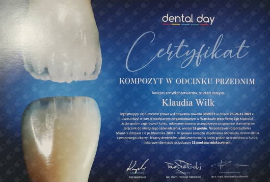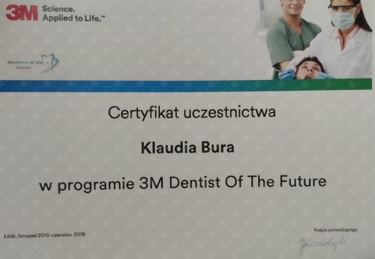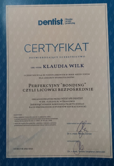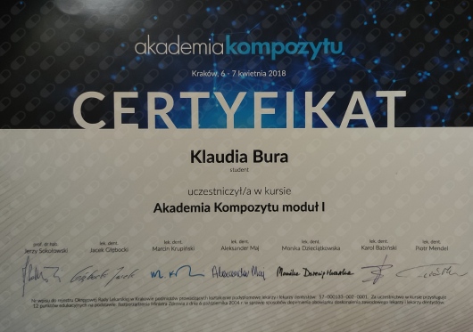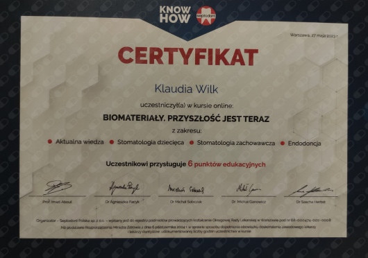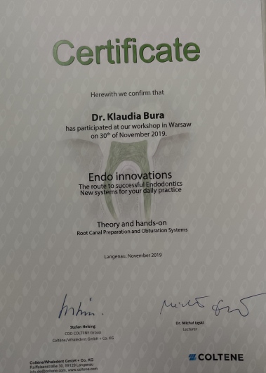 Nieustannie podnoszę swoje kwalifikacje zawodowe uczestnicząc w kursach i szkoleniach z zakresu stomatologii zachowawczej, endodoncji oraz protetyki. Ukończyłam Curriculum Endodontyczne, dzięki któremu poszerzyłam swoją wiedzę z zakresu endodoncji, mikrochirurgii endodontycznej oraz traumatologii.