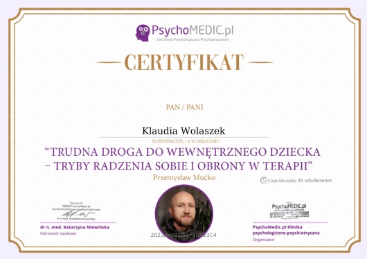 Pani Klaudia jest świetnym specjalistą i po prostu dobrym człowiekiem. Okazała mi bardzo dużo zrozumienia i wsparcia, poprzez konsekwencję w swojej pracy pozwoliła mi lepiej zrozumieć samego siebie. Terapia nie była dla mnie łatwym krokiem, ale Pani Klaudia bardzo mi pomogła, a z perspektywy czasu mogę stwierdzić, że żałuję jedynie, że na terapię nie zdecydowałem się wcześniej.