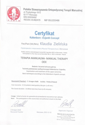 Terapia manualna UEX, OEX, UWS, (2022) OWS, AEX1, AEX2 (2023) (Kaltenborn-Evjenth Concept)