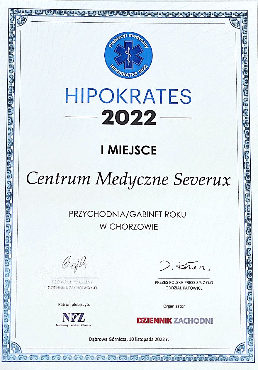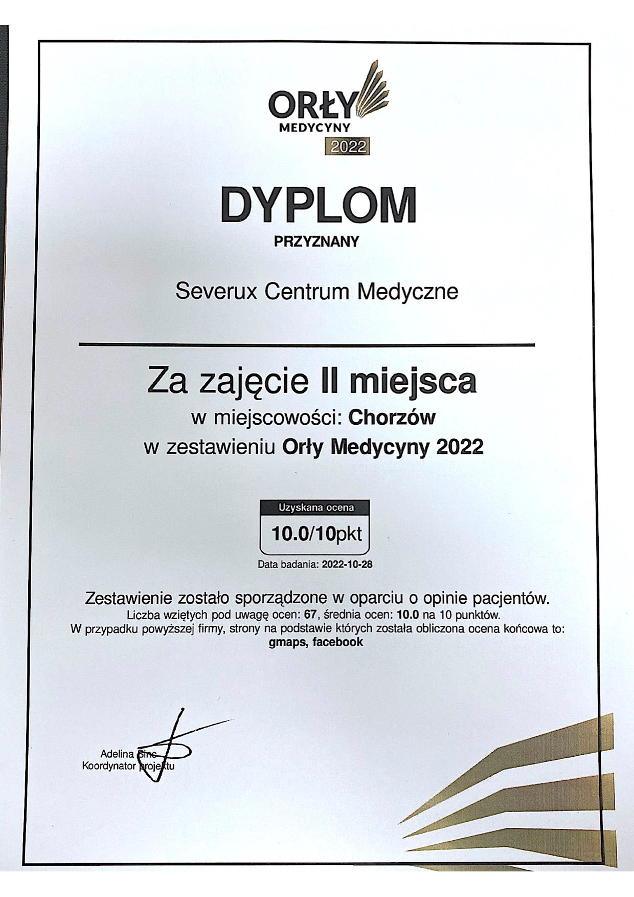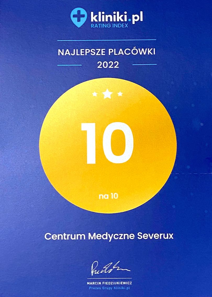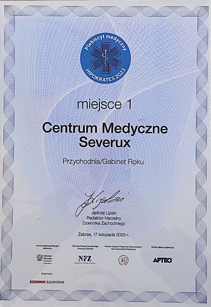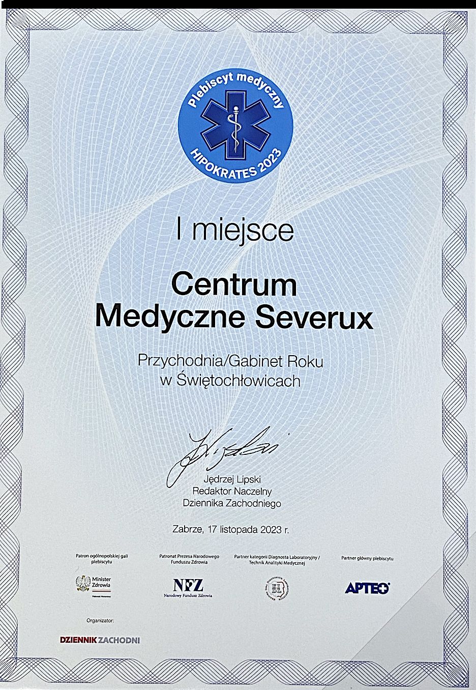 Centrum Medyczne Severux działa w ramach dwóch placówek zlokalizowanych w Chorzowie (ul. Katowicka 157) oraz w nowej placówce w Świętochłowicach (ul. Sikorskiego 1), znajdującej się bezpośrednio przy zjeździe z Drogowej Trasy Średnicowej. Zespół naszych specjalistów liczy ponad 100 osób i stale się powiększa. To fantastyczni ludzie - kompetentni i empatyczni, traktujący pacjenta z szacunkiem i troską. Znajdziesz u nas m.in. szybkie terminy konsultacji, aparaturę medyczną najwyższej jakości, umiarkowane ceny, łatwy dojazd i duży osobny parking. Zapraszamy do skorzystania z prywatnych konsultacji w następujących specjalnościach: alergologia, akupunktura, chirurgia naczyniowa i ogólna, dermatologia, diabetologia, dietetyka, endokrynologia, fizjoterapia, ginekologia, hematologia, interna, kardiologia, laryngologia, medycyna estetyczna, medycyna pracy, neurologia, okulistyka, onkologia, optometria, ortodoncja, ortopedia, pediatria, podologia, poradnia leczenia bólu, poradnia leczenia ran przewlekłych, poradnia leczenia stopy cukrzycowej, pracownia USG, psychiatria, psychologia, reumatologia, stomatologia i urologia. W placówce w Świętochłowicach działa też punkt pobrań oraz pracownia radiologii stomatologicznej. Do zobaczenia w CM Severux! : )
