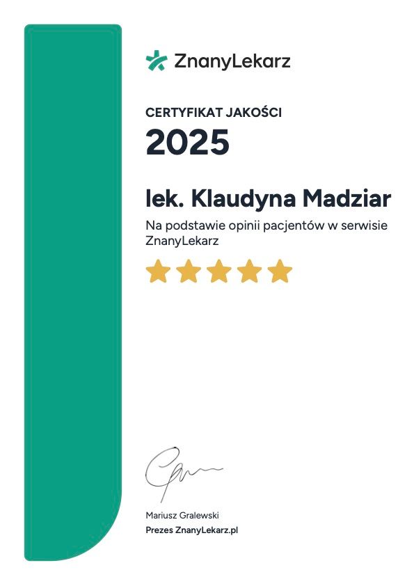Jak Klaudyna Madziar umawia wizyty?Klaudyna Madziar używa kalendarza ZnanyLekarz, dlatego na stronie widzisz aktualne terminy. Wystarczy, że wybierzesz datę i godzinę, które odpowiadają Ci najbardziej. Umawianie wizyty jest darmowe, a tuż przed terminem wyślemy Ci przypomnienie.