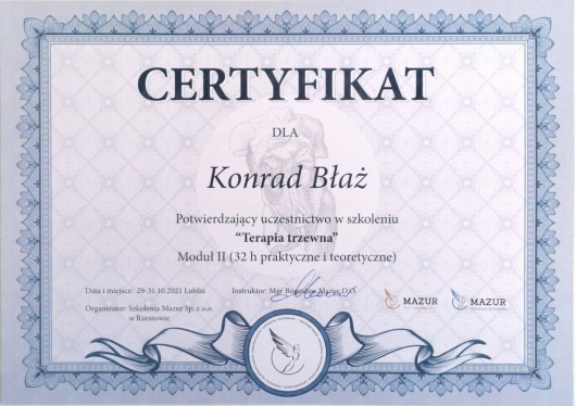 Konrad jest bardzo otwartą osobą, która jest ukierunkowana na skuteczne rozwiązywanie problemów, dlatego przeprowadza bardzo dokładny wywiad i tworzy komfortową atmosferę w gabinecie.