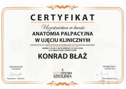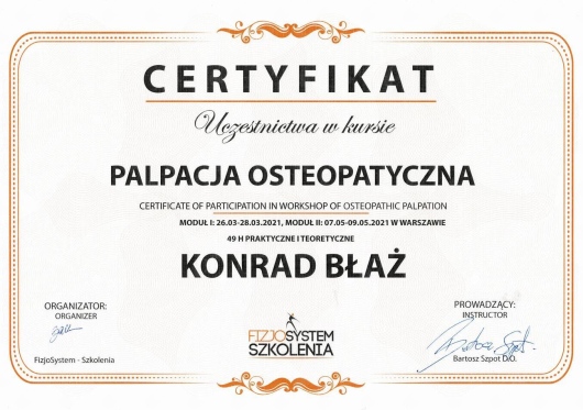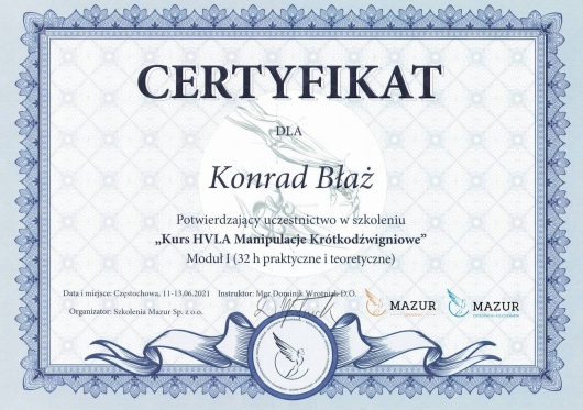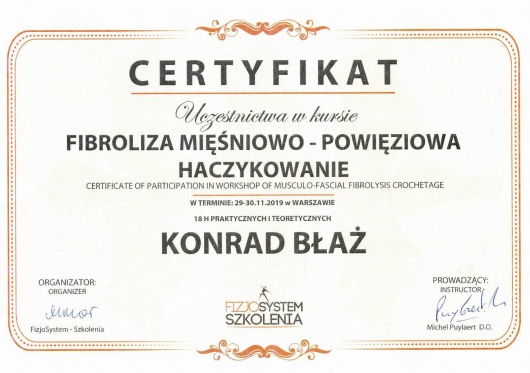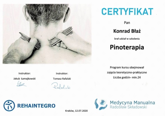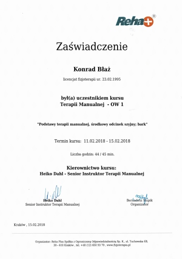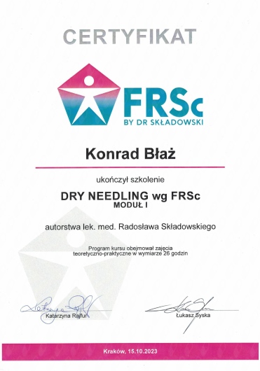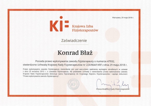 Polecam Konrada jako specjalistę, biorąc pod uwagę jego szerokie doświadczenie oraz różnorodność dostępnych u niego metod leczenia. Byłem u niego parę razy z bólem różnych okolic (bark, kręgosłup, kolano) i zawsze spojrzał na problem z szerokiej perspektywy. Zazwyczaj leczenie kończyło się na jednej wizycie, a systematyczne wykonywanie ćwiczeń zleconych przez Konrada w zupełności eliminowały ból.