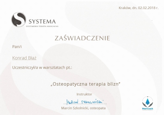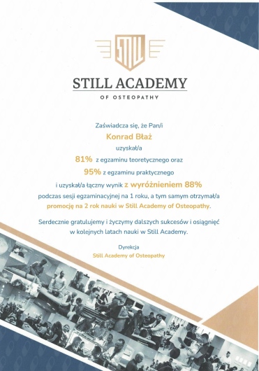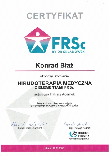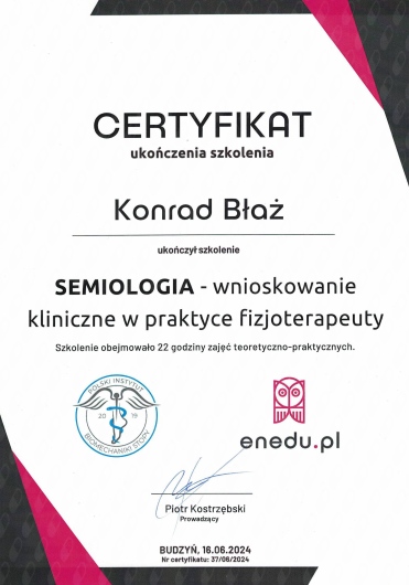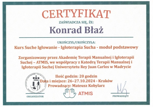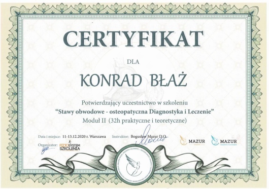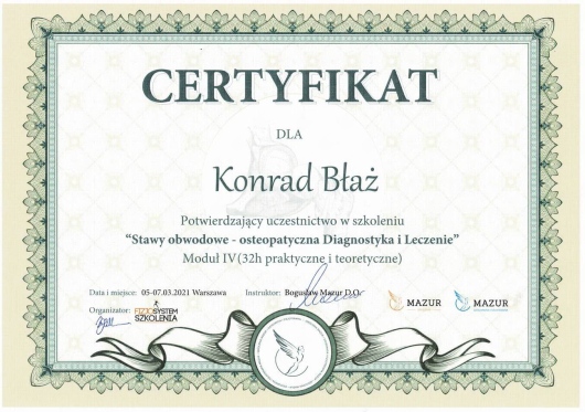 Z pasją i profesjonalizmem podchodzę do holistycznej terapii, łącząc wiedzę z zakresu fizjoterapii, osteopatii, dietetyki i psychologii. Jako absolwent Akademii Wychowania Fizycznego w Krakowie, nieustannie poszerzam swoje kompetencje poprzez specjalistyczne szkolenia i certyfikacje w dziedzinie terapii manualnej oraz osteopatycznej. Obecnie jestem studentem osteopatii w Still Academy of Osteopathy. Specjalizuję się w kompleksowym leczeniu dolegliwości układu ruchu oraz problemów wewnętrznych, wykorzystując innowacyjne metody terapeutyczne, w tym osteopatię, pinoterapię oraz hirudoterapię. Moje podejście terapeutyczne opiera się na dokładnej diagnostyce i indywidualnym dopasowaniu metod leczenia do potrzeb każdego pacjenta. Obszary mojej specjalizacji obejmują: - Terapię osteopatyczną dla dorosłych - Leczenie przewlekłych dolegliwości bólowych kręgosłupa i stawów - Terapię zaburzeń układu pokarmowego i hormonalnego - Leczenie dysfunkcji psychosomatycznych - Kompleksową terapię wad postawy - Rehabilitację pourazową W swojej praktyce kieruję się przekonaniem, że skuteczne leczenie wymaga całościowego spojrzenia na człowieka. Stale pogłębiam swoją wiedzę, uczestnicząc w specjalistycznych szkoleniach i kursach, aby oferować pacjentom najwyższej jakości opiekę terapeutyczną. Poza praktyką medyczną rozwijam swoje artystyczne pasje - maluję oraz gram na perkusji. Wierzę, że różnorodność zainteresowań pozwala mi lepiej rozumieć potrzeby moich pacjentów i budować z nimi relacje oparte na zaufaniu i empatii.