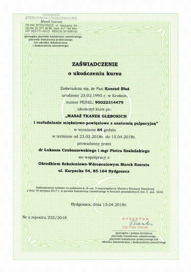 Szczerze polecam Pana Konrada. Zmagałem się z przeszywającym bólem ramienia wraz z drętwieniem dłoni oraz ograniczoną ruchomością całej ręki. Pan Konrad zdziałał cuda - po trzech sesjach brak bólu. Jak najbardziej polecam Pana Konrada.