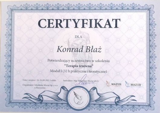 Serdecznie polecam Pana Konrada. Profesjonalne podejście, ogromna wiedza jest to osoba, która potrafi wysłuchać pacjenta i podchodzi do problemu całościowo. Po pierwszym spotkaniu poczułem znaczna.poprawe. Serdecznie polecam!!!