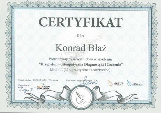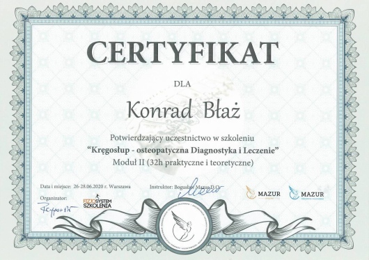 Jaki jest zakres porad oferowanych przez Konrad Błaż?Konrad Błaż to fizjoterapeuta. Na podstawie swojego doświadczenia i wykształcenia Konrad Błaż oferuje usługi takie jak: fizjoterapia, Stan ostry - Rehabilitacja z wykorzystaniem technik osteopatycznych, Fizjoterapia z wykorzystaniem technik osteopatycznych, Hirudoterapia, suche igłowanie, konsultacja fizjoterapeutyczna, osteopatia, konsultacja osteopatyczna kobiet w ciąży i okresie okołoporodowym, Terapia czaszkowo-krzyżowa, Terapia manualna.