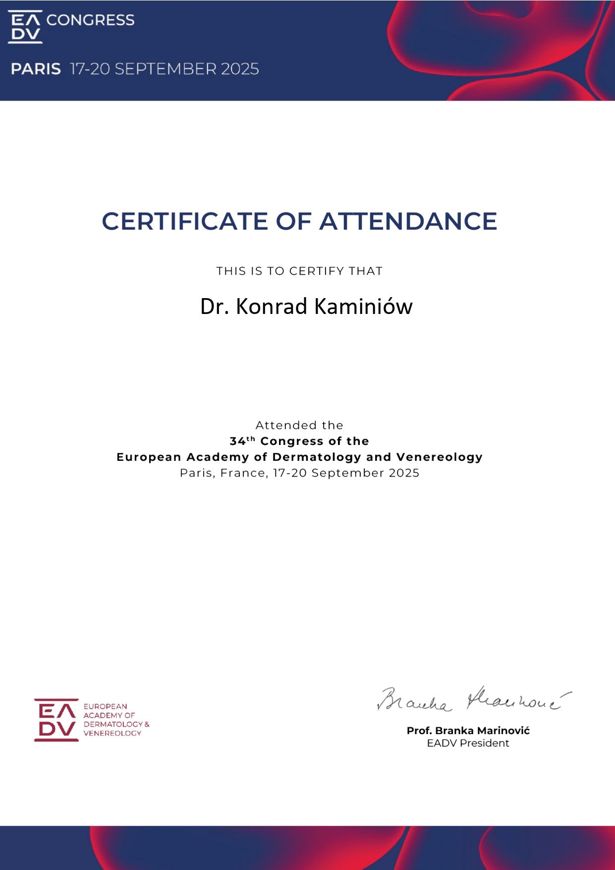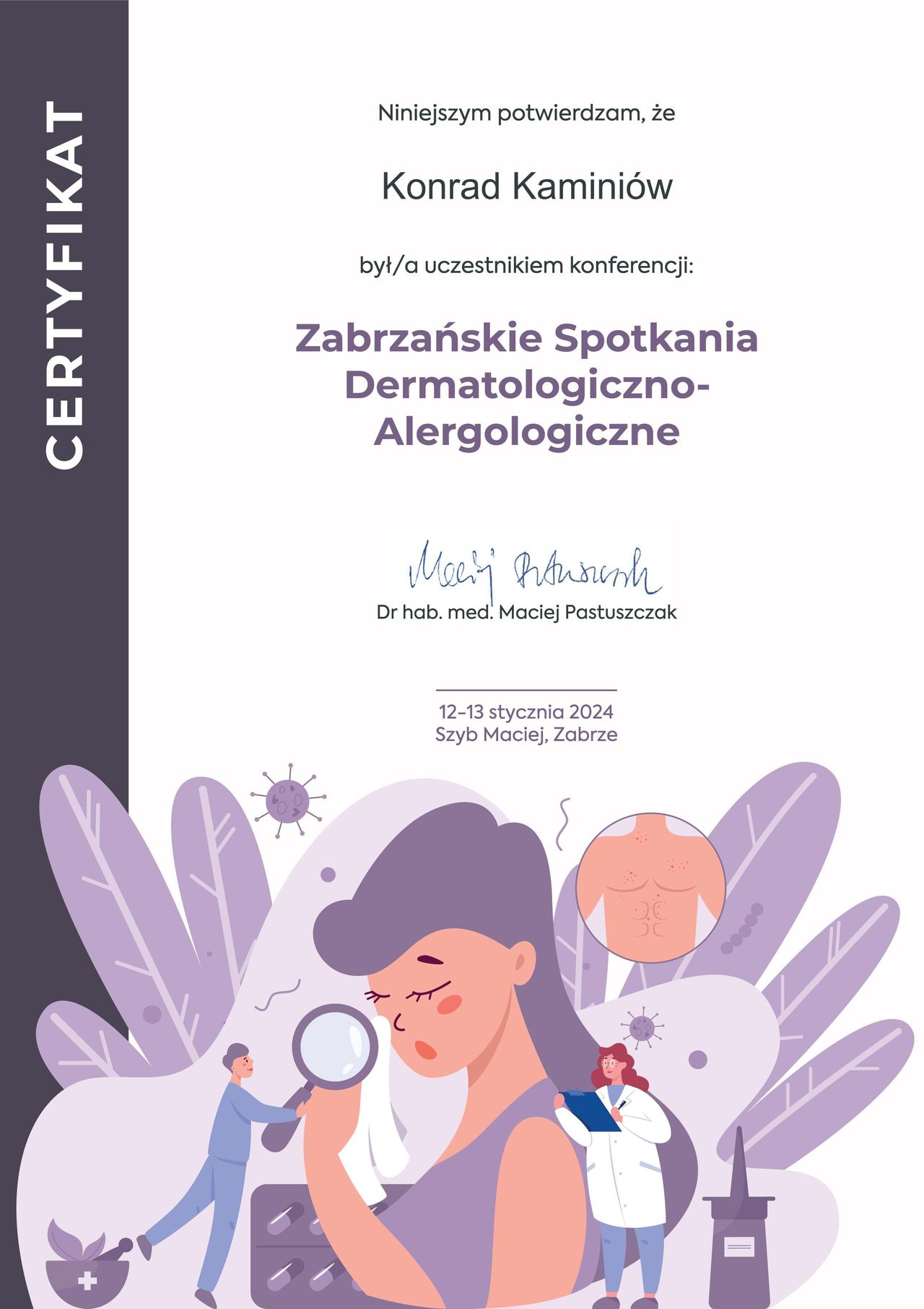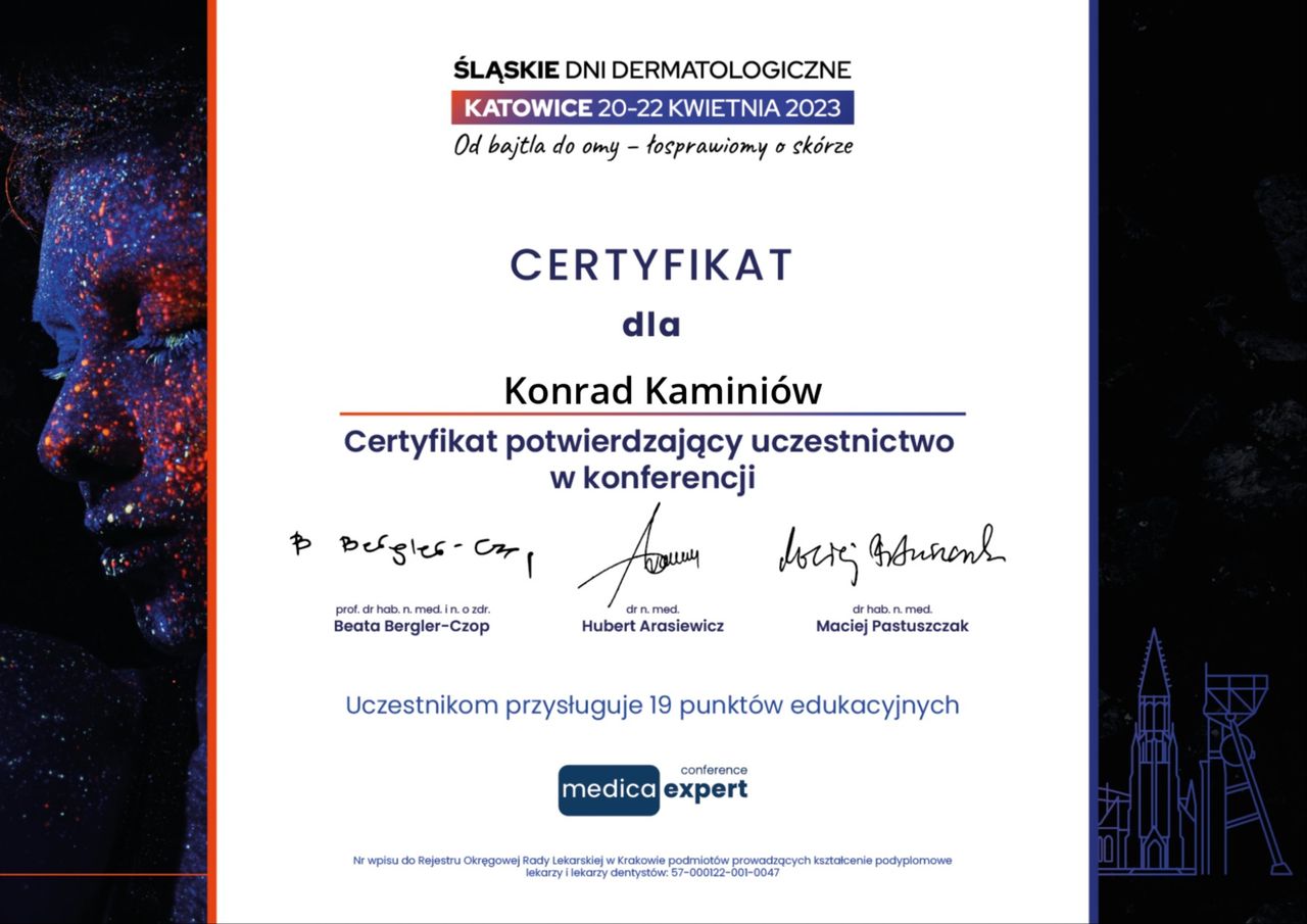 Absolwent studiów podyplomowych „Medycyna Estetyczna dla Lekarzy” realizowanych przez Akademię Górnośląską w Katowicach.