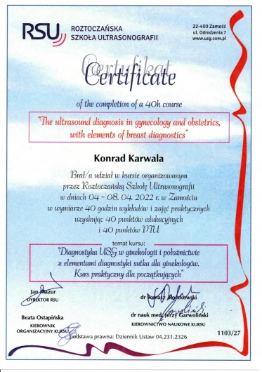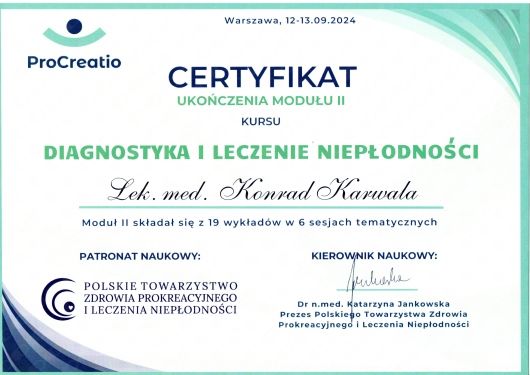 Jaki jest zakres porad oferowanych przez Konrad Karwala?Konrad Karwala to w trakcie specjalizacji (ginekolog). Na podstawie swojego doświadczenia i wykształcenia Konrad Karwala oferuje usługi takie jak: konsultacja ginekologiczna, konsultacja ginekologiczna + USG, konsultacja leczenia niepłodności (pierwsza wizyta), konsultacja leczenia niepłodności (kolejna wizyta), USG piersi, monitorowanie owulacji, badanie cytologiczne, cytologia cienkowarstwowa LBC, Konsultacja antykoncepcyjna pierwsza, prowadzenie ciąży.