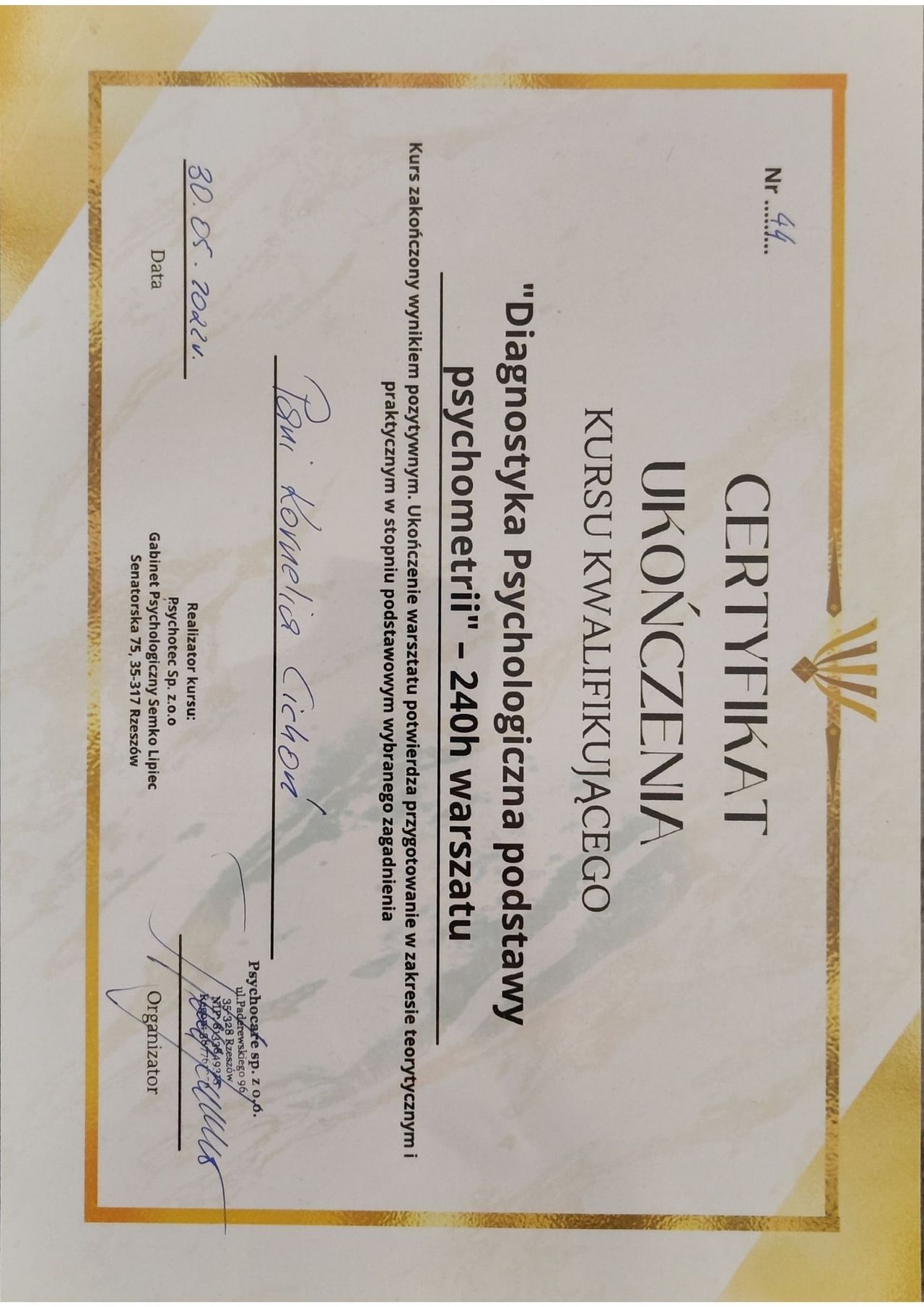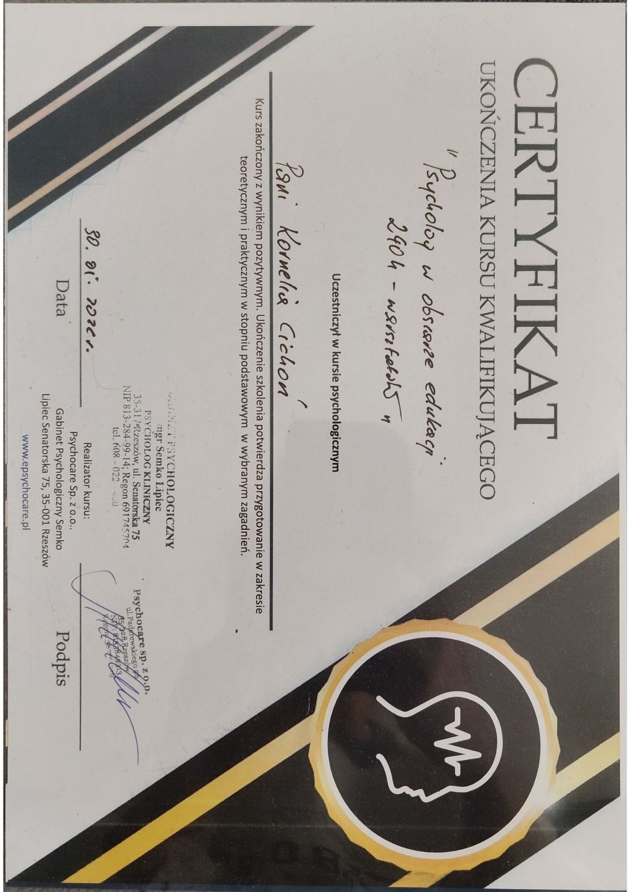 Nazywam się Kornelia Cichoń i pracuję w nurcie relacyjnym, opartym na autentycznej obecności i spotkaniu człowiek–człowiek. W swojej pracy łączę profesjonalną wiedzę psychologiczną z dojrzałością, uważnością i empatią oraz holistycznym spojrzeniem na dobrostan – obejmującym emocje, umysł, ciało i intuicję.
