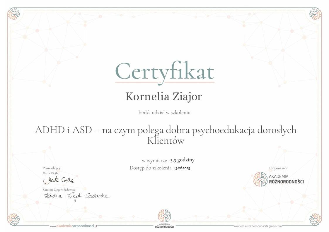 Zajmuję się także diagnozowaniem ADHD u osób dorosłych – pomagam uporządkować doświadczenia, które często przez lata były źródłem frustracji, poczucia „inności” czy chaosu. Proces diagnozy traktuję nie jak ocenę, ale jak wspólne odkrywanie wzorców funkcjonowania – po to, by zrozumieć siebie głębiej i znaleźć sposób działania, który naprawdę wspiera.