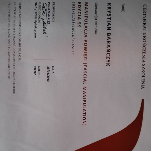 Witam , pracuje w zawodzie od 2012 roku , przez ten czas ukierunkowałem się na globalne podejście do pacjenta poprzez pracę na powięzi , z reguły ból to skutek , podpowiedź organizmu że coś złego się dzieje w naszym ciele i trzeba szukać przyczyny aby go zniwelować lub wyciszyć . Migreny , rwy kulszowe, barkowe , terapia bólu , stany ostre i przewlekłe, rehabilitacja przed i po operacyjna , ortopedia , neurologia z takimi pacjentami najczęściej pracuje.