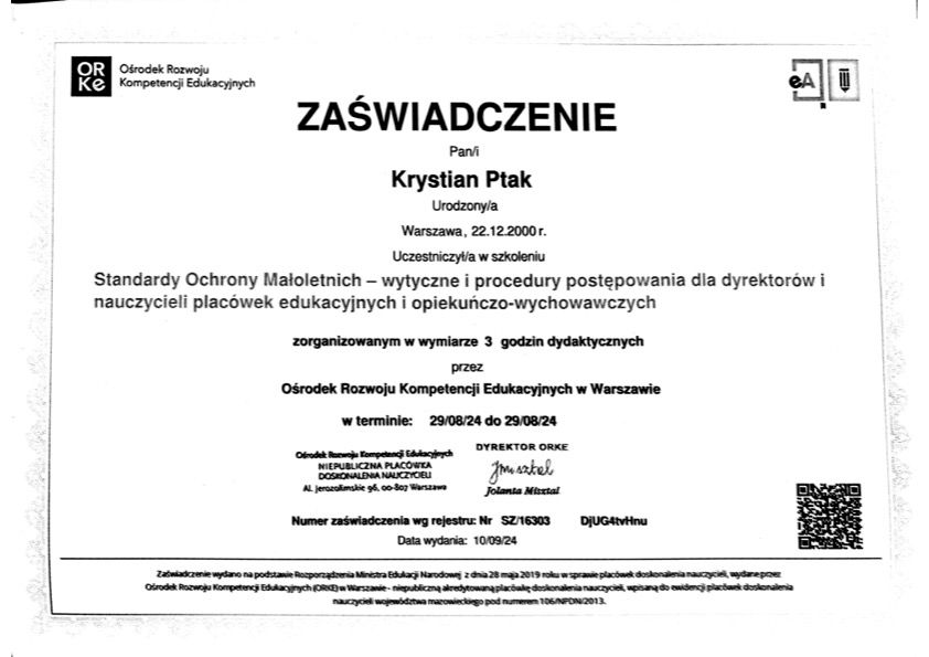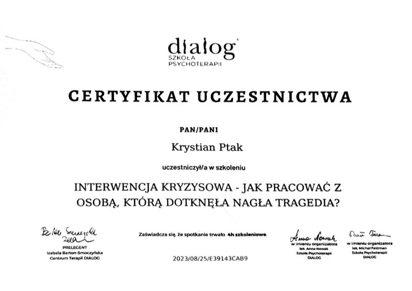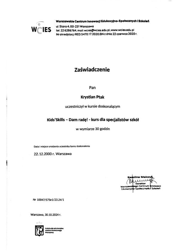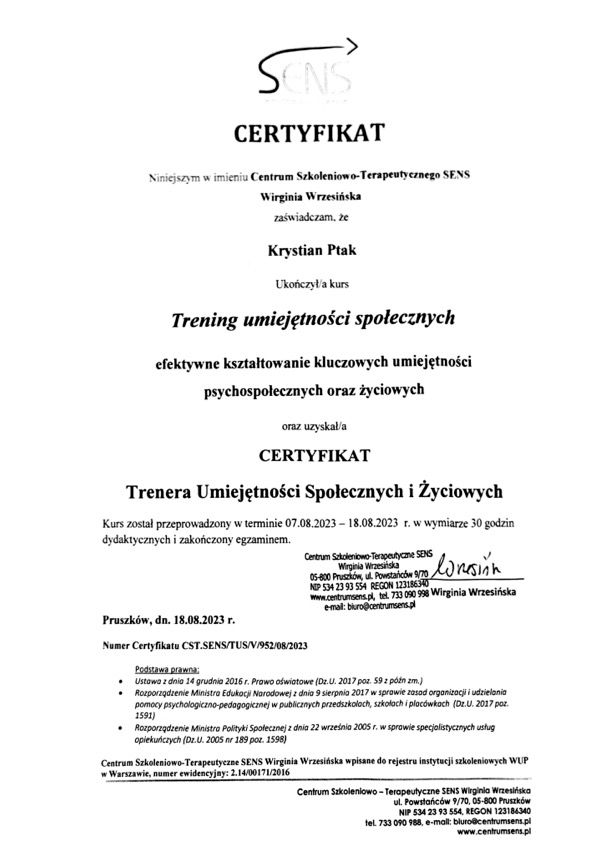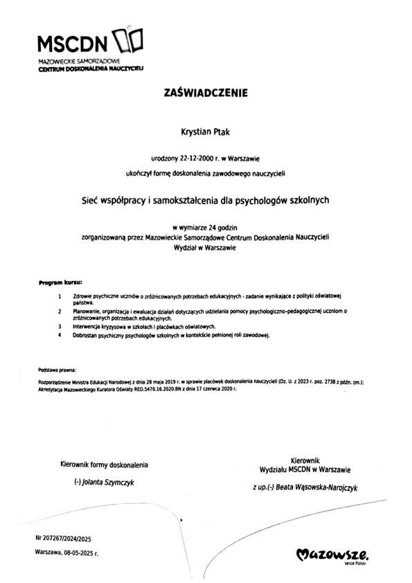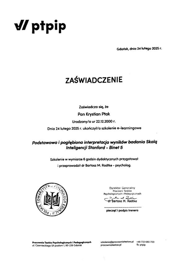 Jestem absolwentem psychologii na Wydziale Pedagogiki i Psychologii Menedżerskiej Akademii Nauk Stosowanych w Warszawie. W trakcie studiów wybrałem specjalność psychologia kliniczna dzieci i dorosłych. Ukończyłem kursy z zakresu Treningu Umiejętności Społecznych (TUS), metody Kids’ Skills oraz kursy uprawniające do korzystania z narzędzi do badania inteligencji. Jestem w trakcie finalizacji studiów podyplomowych z zakresu przygotowania pedagogicznego dla psychologów.