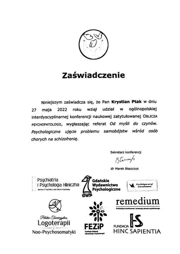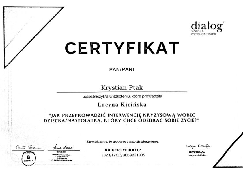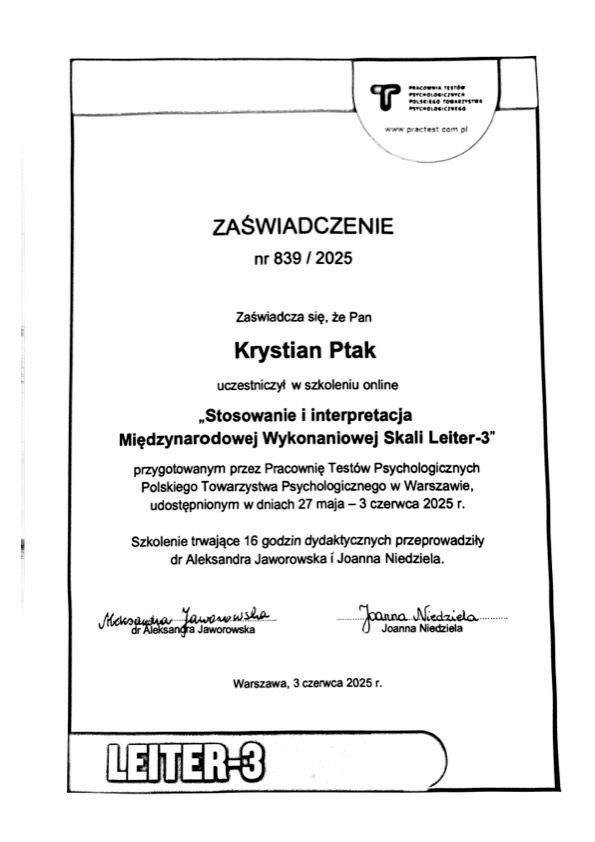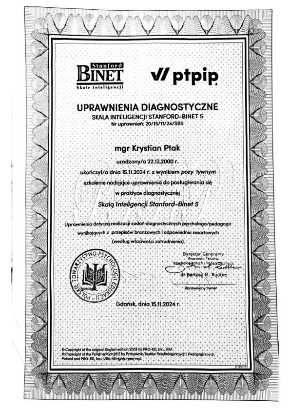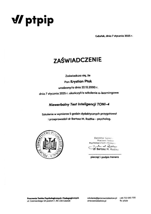 Jaki jest zakres porad oferowanych przez Krystian Ptak ?Krystian Ptak to psycholog. Na podstawie swojego doświadczenia i wykształcenia Krystian Ptak oferuje usługi takie jak: Diagnoza ADHD dzieci i młodzieży, konsultacja psychologiczna dzieci i młodzieży, Diagnoza inteligencji (dorośli i dzieci) - Stanford-Binnet 5.