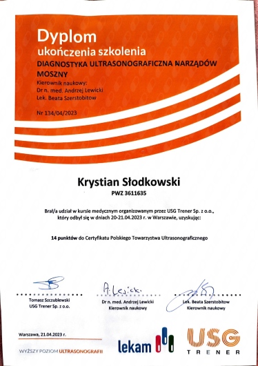 Jaki jest zakres porad oferowanych przez Krystian Słodkowski?Krystian Słodkowski to w trakcie specjalizacji (urolog). Na podstawie swojego doświadczenia i wykształcenia Krystian Słodkowski oferuje usługi takie jak: konsultacja urologiczna, konsultacja urologiczna + USG układu moczowego, konsultacja urologiczna + USG moszny, konsultacja urologiczna + usg moszny + usg układu moczowego, Konsultacja telefoniczna - Urolog.
