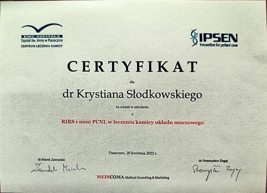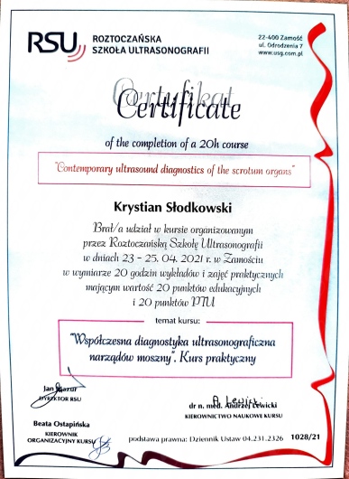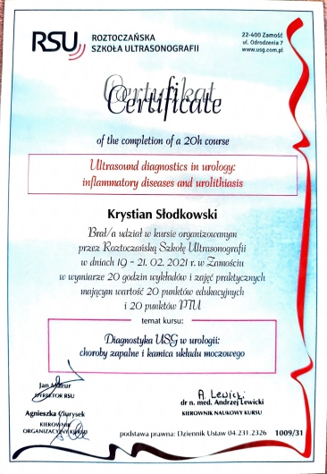Od 2021 r. realizuję szkolenie specjalizacyjne w zakresie Urologii w Pododdziale Urologii Wojewódzkiego Szpitala Specjalistycznego im. M. Skłodowskiej - Curie w Zgierzu.