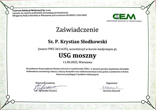 Profesjonalizm,zaangażowanie,staranna i wnikliwa analiza badań uchroniła mnie przed zabiegiem, który w chwili obecnej nie był konieczny. Lekarz Krystian Słodkowski wykazuje niezwykłą cierpliwość i wrażliwość, co sprawia, że pacjent czuje się bezpiecznie i dobrze zaopiekowany.