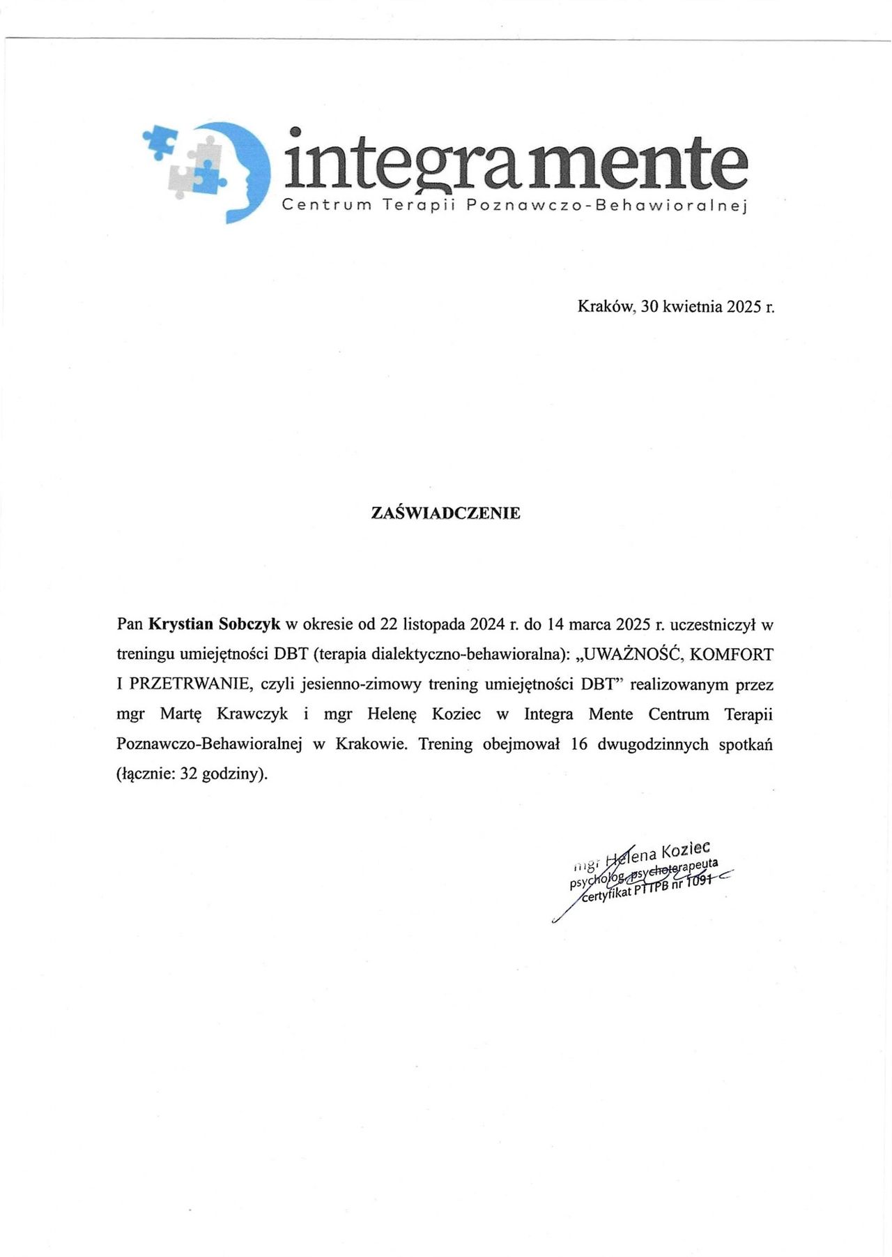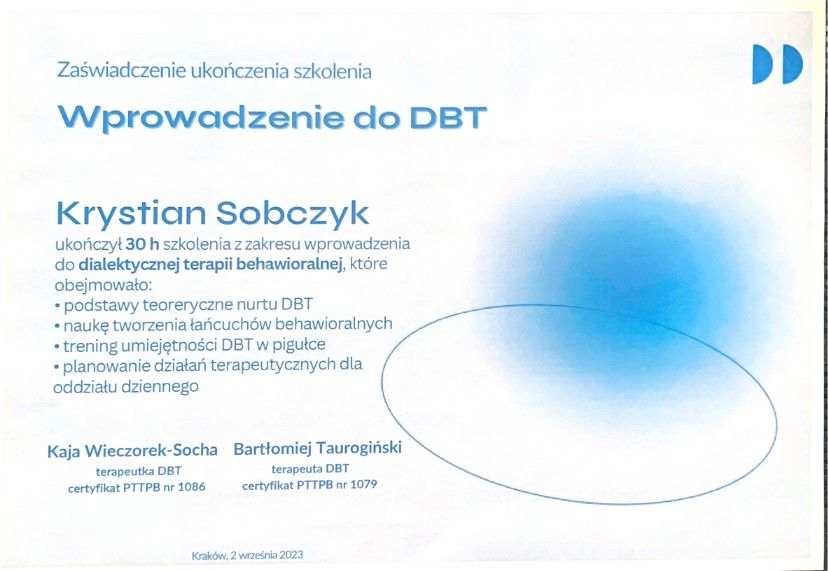 Jaki jest zakres porad oferowanych przez Krystian Sobczyk?Krystian Sobczyk to psychoterapeuta, psycholog. Na podstawie swojego doświadczenia i wykształcenia Krystian Sobczyk oferuje usługi takie jak: Konsultacja psychologiczna, psychoterapia indywidualna, konsultacja psychoterapeutyczna, Psychoterapia poznawczo-behawioralna.