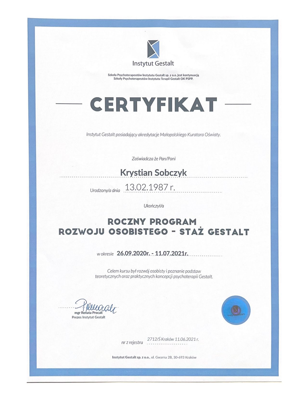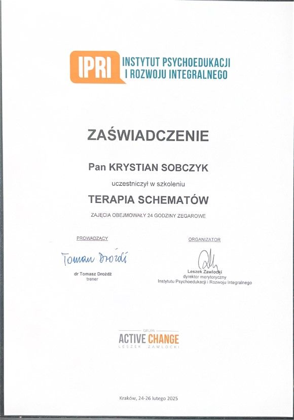 Ukończyłem studia magisterskie z psychologii na Uniwersytecie Andrzeja Frycza Modrzewskiego w Krakowie. Odbyłem roczny staż w nurcie Gestalt w Instytucie Gestalt w Krakowie oraz staż kliniczny w Krakowskim Instytucie Psychoterapii.