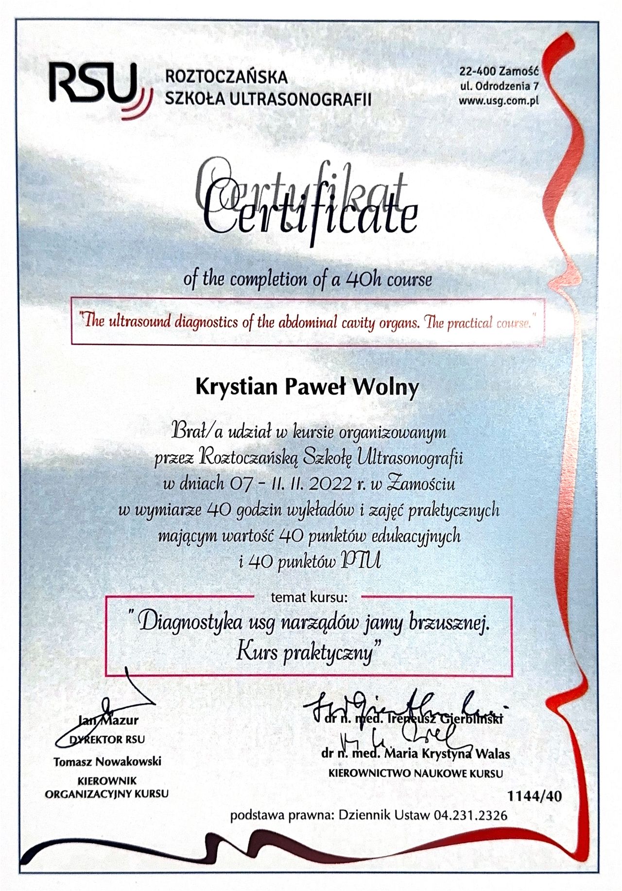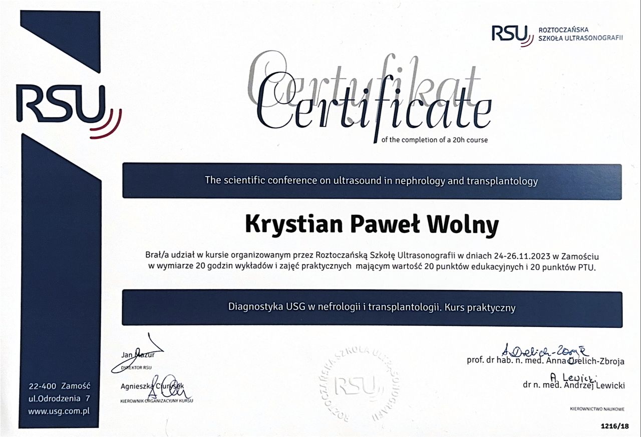 Szczególnym obszarem moich zainteresowań jest ultrasonografia. Regularnie rozwijam swoje umiejętności w tym zakresie zarówno podczas kursów, jak i w codziennej praktyce lekarskiej, traktując USG jako ważne narzędzie wspomagające diagnostykę chorób nerek.