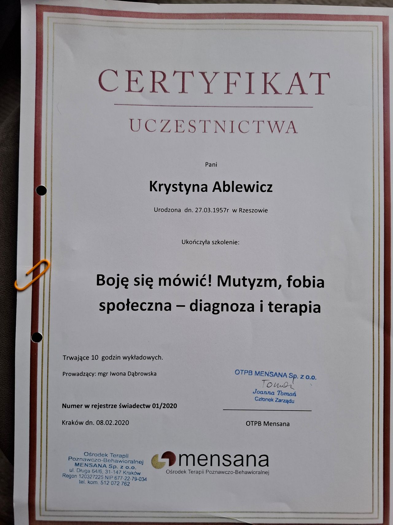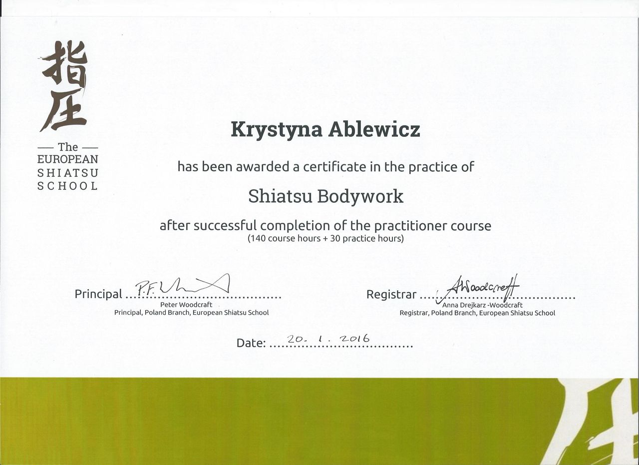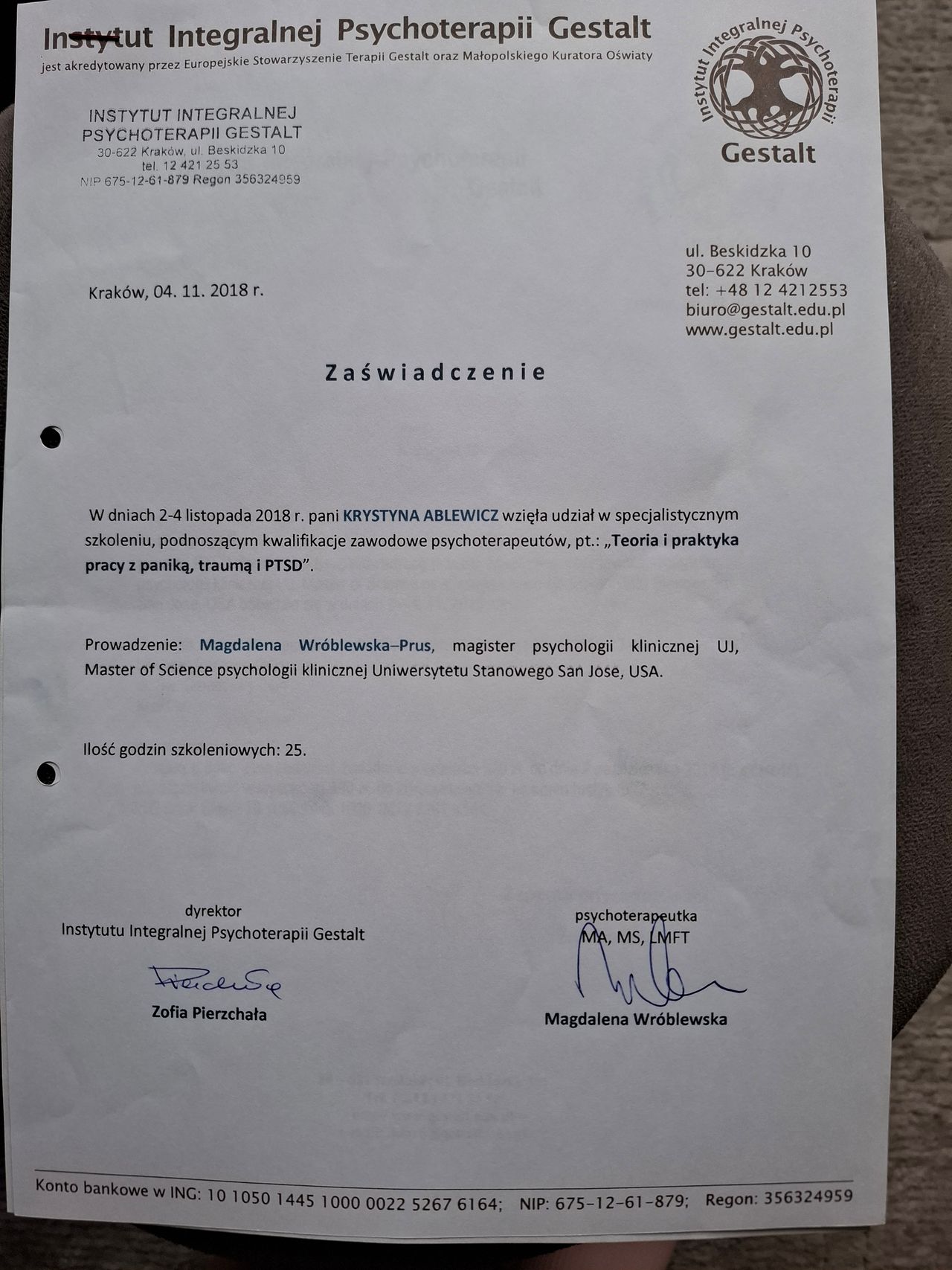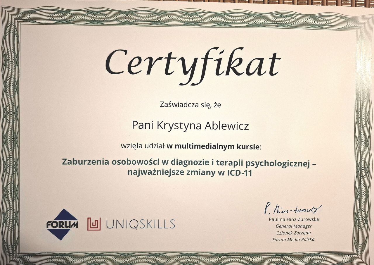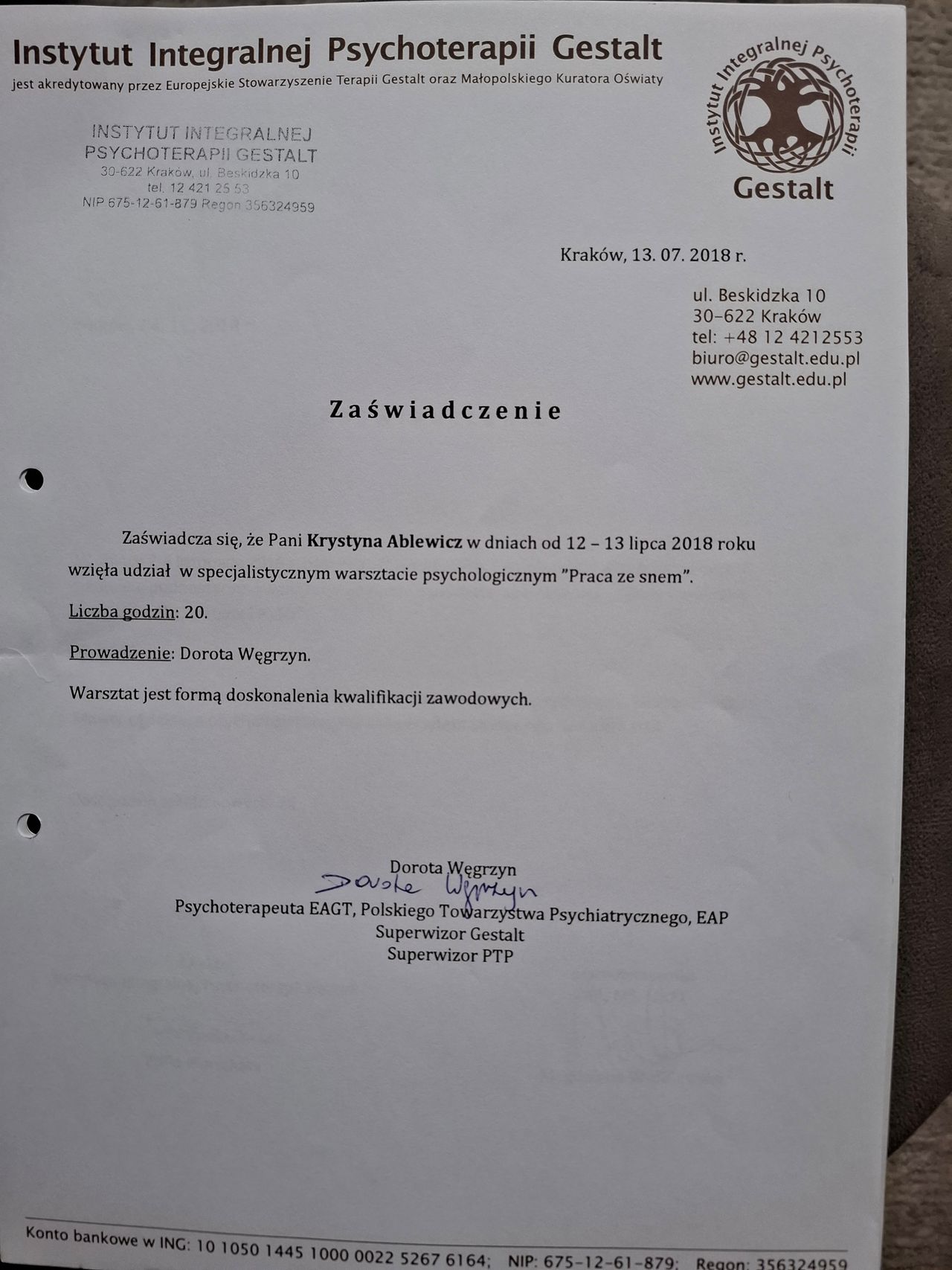 Jako psychoterapeutka, oprócz Szkoły IIPG w Krakowie ukończyłam certyfikowane warsztaty specjalistyczne m. in. pracy z parą, pracy z traumą, ze snem, z wstydem, lękiem społecznym. Psychoterapią zajmuję się od ponad 8 lat. Posiadam też certyfikat Tutora oraz Shiatsu Bodywork (japoński masaż odprężający).