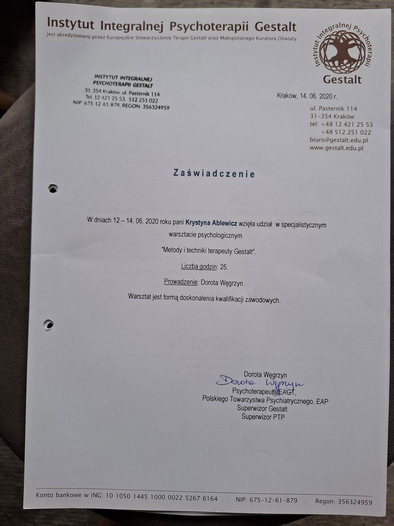 Swoją pracę psychoterapeutyczną poddaję systematycznej superwizjii, a moje nazwisko znajduje się wśród psychoterapeutów polecanych przez Instytut Integralnej Psychoterapii Gestalt w Krakowie https://gestalt.edu.pl/znajdz-terapeute/