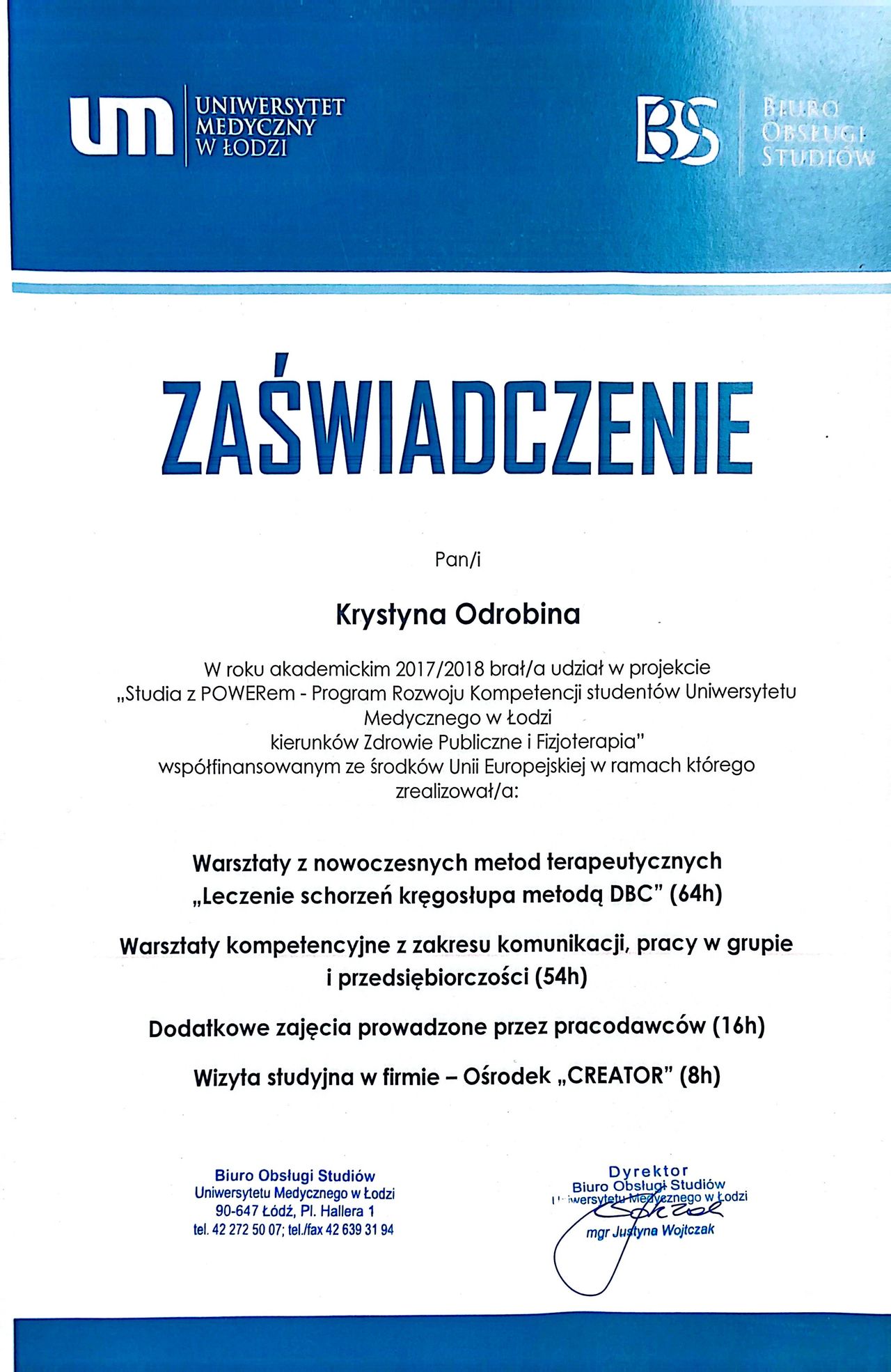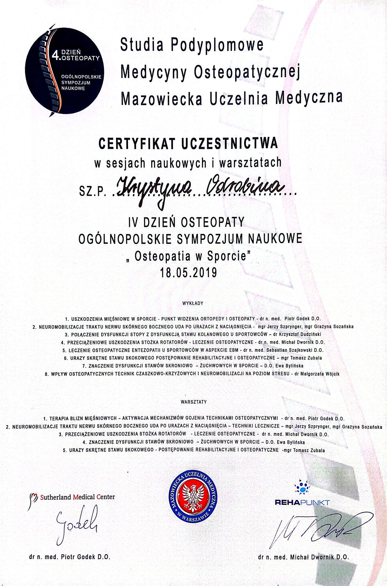 Fizjoterapeutka, Terapeutka osteopatyczna, Specjalistka akupunktury. Przyjmuję młodzież od 16 r.ż. oraz dorosłych. Jestem fizjoterapeutką z Uniwersytetu Medycznego w Łodzi oraz osteopatą, dyplomowaną absolwentką FICO (Flanders International College of Osteopathy). W gabinecie skupiam się na przynoszeniu ulgi. Wykorzystuję pracę manualną, techniki osteopatyczne, jak i fizjoterapię oraz akupunkturę. Moja misja polega na tym by we własnym ciele czuć się maksymalnie swobodnie i zdrowo, aby ciało nie stawiało nam ograniczeń do życia w pełni. Przyjmuje pacjentów w każdym wieku i prowadzę terapię sacro-cranialną(czaszkową), wisceralną (narządów wewnętrznych) jak i strukturalną (przy urazach, kontuzjach). W mojej pracy ogromnie inspirują mnie słowa Henry Ward Beecher "Ciało jest jak pianino, a szczęście jak muzyka. Jest to bardzo potrzebne aby instrument był zadbany”. Moim zadaniem jako terapeutki jest spojrzeć na pacjenta jako wieloskładnikową skomplikowaną jednostkę, istotą mojej pracy jest odnalezienie przyczyny bólu lub dysfunkcji, naprowadzenie organizmu w kierunku zdrowia oraz edukowanie pacjenta tak aby mógł wrócić do pełnej sprawności. Spojrzenie na ciało i umysł jako całość pozwala na działanie w kierunku harmonii i zwiększenie wydajności pacjenta co prowadzi do zdrowia.