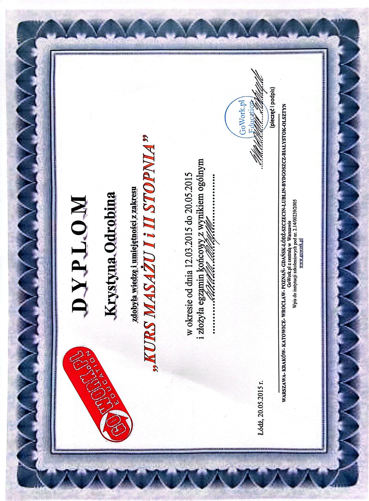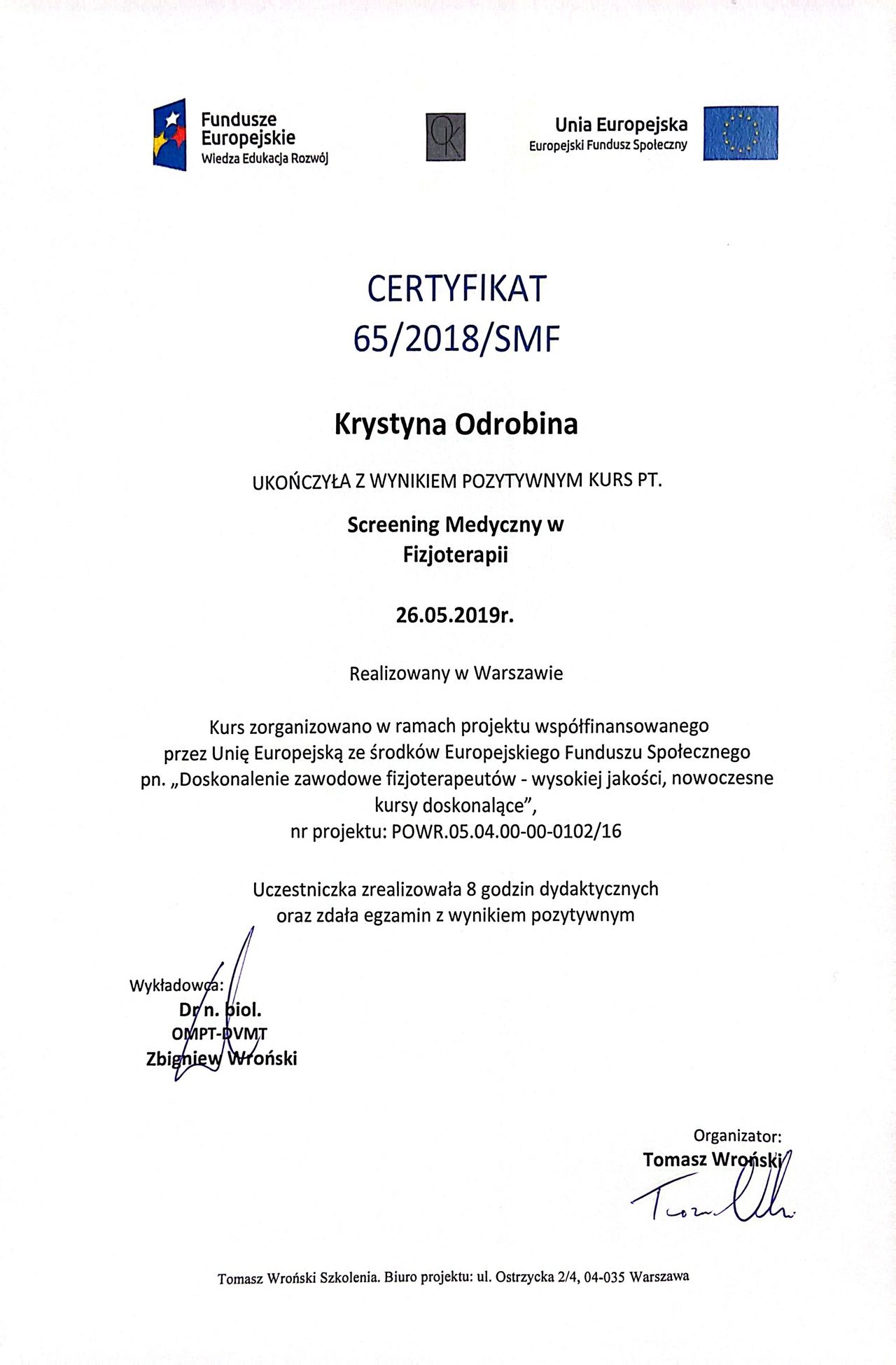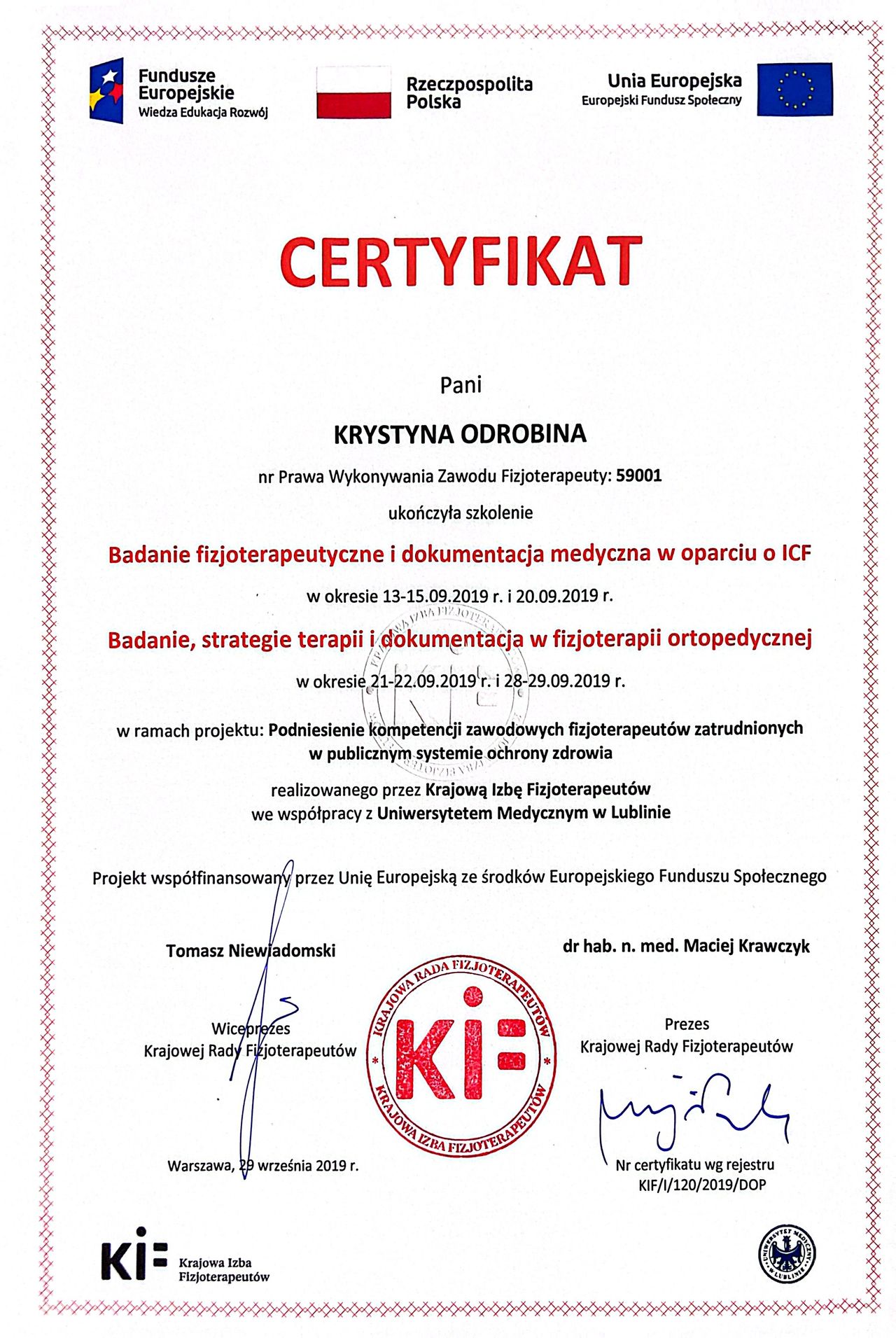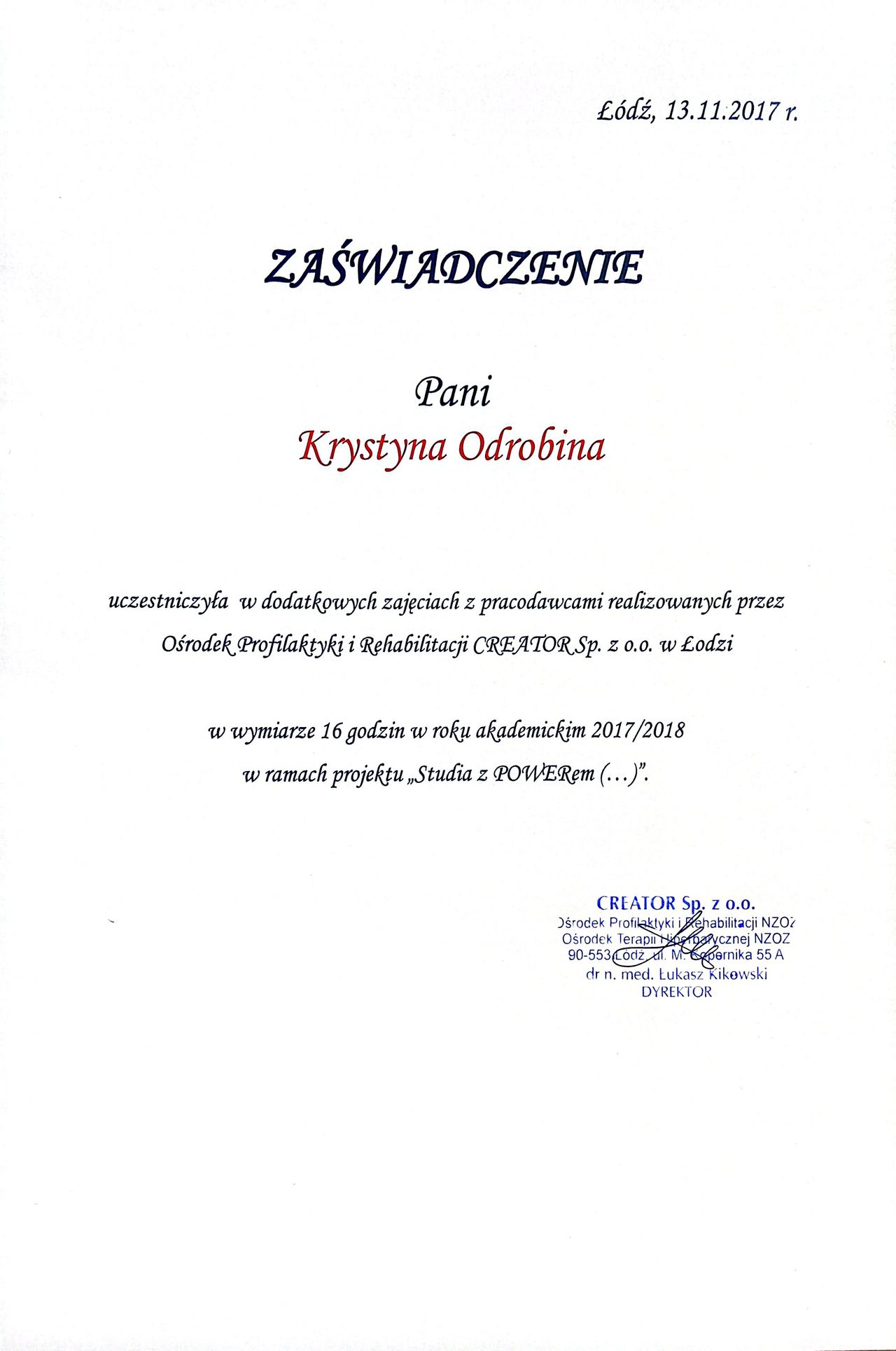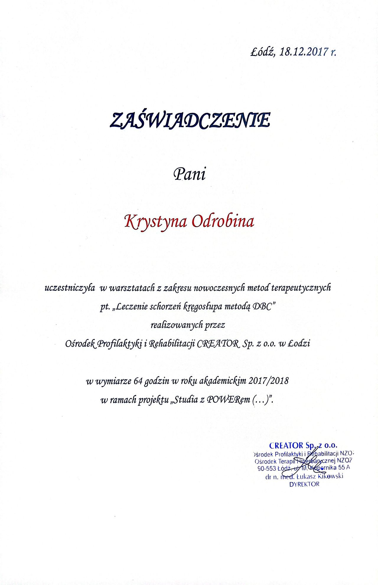 Jaki jest zakres porad oferowanych przez Krystyna Odrobina?Krystyna Odrobina to fizjoterapeuta, osteopata. Na podstawie swojego doświadczenia i wykształcenia Krystyna Odrobina oferuje usługi takie jak: badanie i fizjoterapia funkcjonalna w uszkodzeniach stawu kolanowego i barkowego, fizjoterapia, Fizjoterapia dyskopatii w ostrym stanie, Fizjoterapia po udarach w chorobach OUN, Fizjoterapia pourazowa, fizjoterapia przed- i pooperacyjna, Fizjoterapia z wykorzystaniem technik osteopatycznych, konsultacja fizjoterapeuty - rehabilitacja manualna (kolejna wizyta), konsultacja fizjoterapeuty - rehabilitacja manualna (pierwsza wizyta), Konsultacja fizjoterapeutyczna ( I wizyta, diagnoza + terapia ).