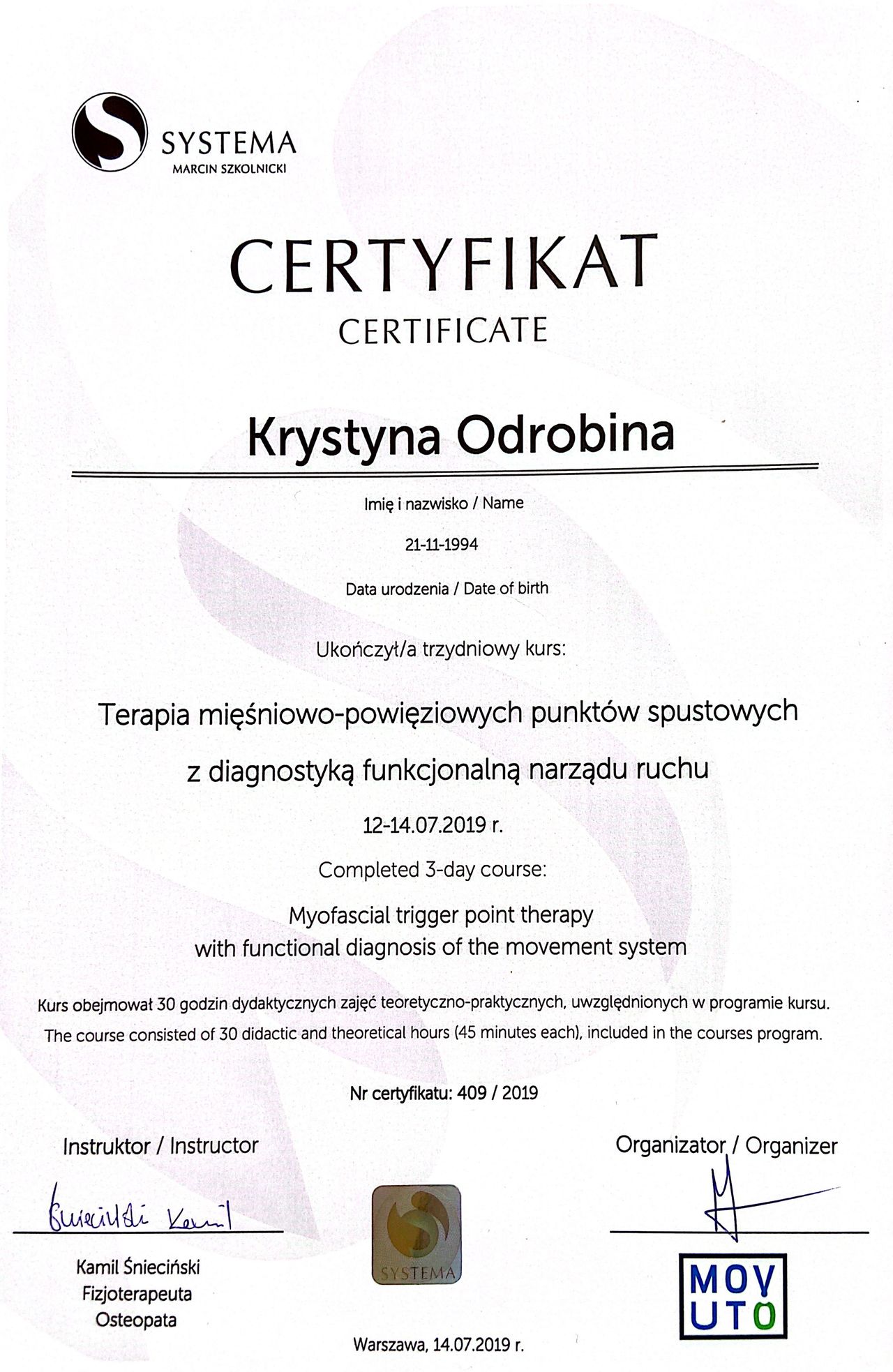 Hey! I'm Krystyna a bilingual osteopath and physiotherapist passionate in curating healthy and functional lifestyles that can be obtained by anyone who is willing, I strongly believe in educating patients to give them the power to make the best decisions. It is a much easier journey to work towards prevention than to fight with an illness or injury that has already occurred. I have a masters in physiotherapy from the Medical University of Łódź, and am a Doctor of osteopathy from Flanders international college of Osteopathy. I work with patients of all ages and backgrounds and besides offering manual therapy a big part of my job is to implement changes in patients day to day lives to make them feel more comfortable strong and healthy. My passion and mission in the office is to work together in managing the patients surroundings and body so that they are given the environment to thrive. “The body is like a piano, and happiness is like music. It is needful to have the instrument in good order.” – Henry Ward Beecher A planned visit can only be cancelled no later than 48 hours before scheduled time. A session that didn’t take place and hadn’t been cancelled or had been cancelled after that time is fully paid. Making an appointment means accepting the regulations provided by Przestrzeń Holistic.