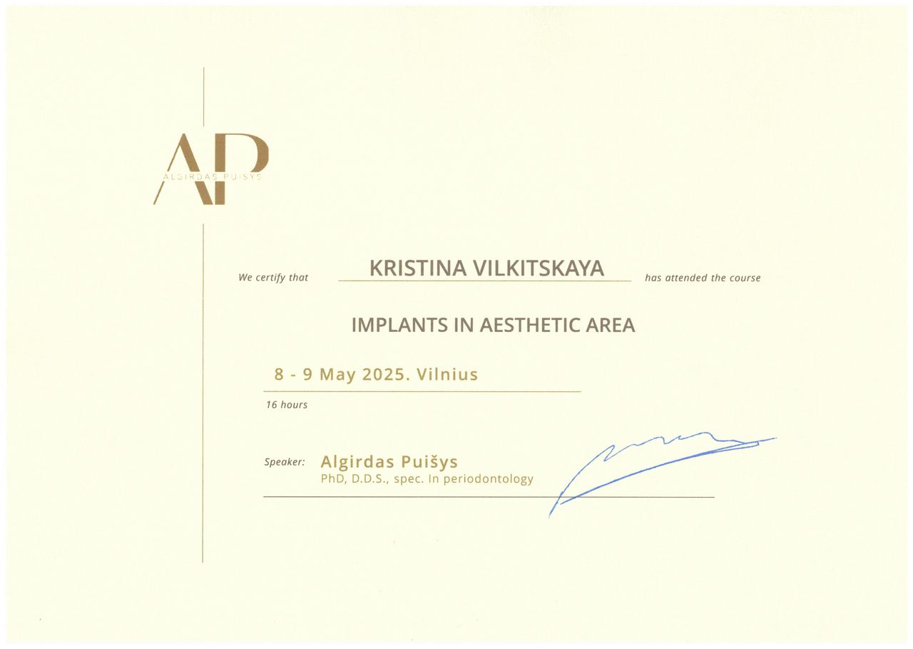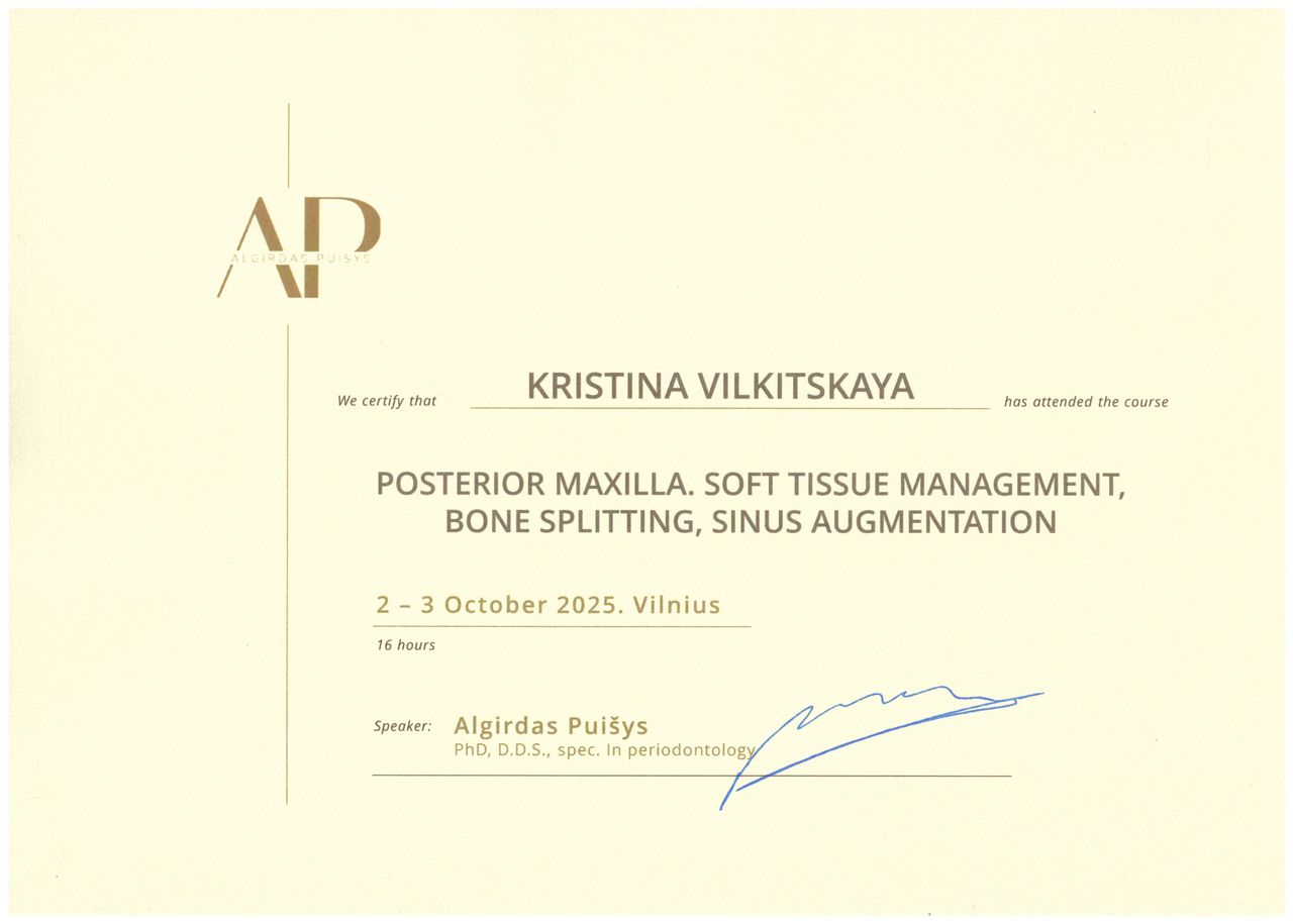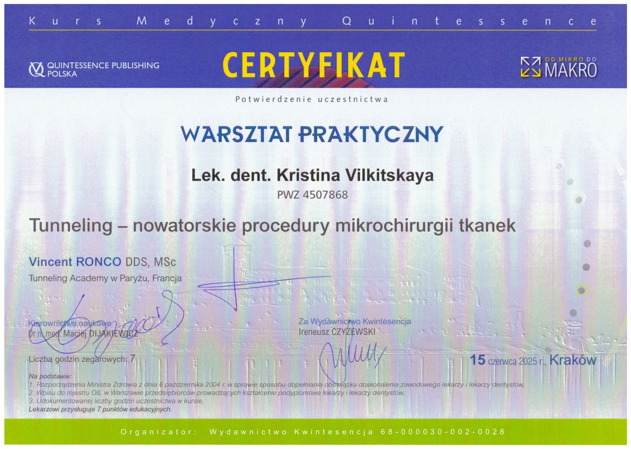 Studia na kierunku dentystycznym ukończyłam w 2009 roku. Pracowałam jako asystent w Zakładzie Chirurgii Stomatologicznej Białoruskiego Państwowego Uniwersytetu Medycznego prowadząc zajęcia ze studentami stomatologii i poszerzając swoją wiedzę pod nadzorem doświadczonych specjalistów. W 2015 roku obroniłam pracę doktorską, w 2018 roku uzyskałam tytuł docenta w medycynie. Uznanie dyplomu ukończenia studiów za granicą za równoważny odpowiedniemu polskiemu dyplomowi i tytułowi zawodowemu uzyskałam na podstawie procedury nostryfikacji w Warszawskim Uniwersytecie Medycznym oraz uzyskania pozytywnego wyniku Lekarsko-Dentystycznego Egzaminu Weryfikacyjnego w Centrum Egzaminów Medycznych w Łodzi w 2023 roku. Staż podyplomowy odbyłam w Centrum Medyczno-Diagnostycznym PRIMA-DENT