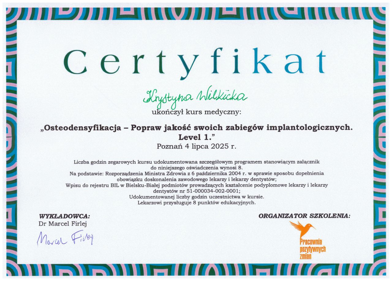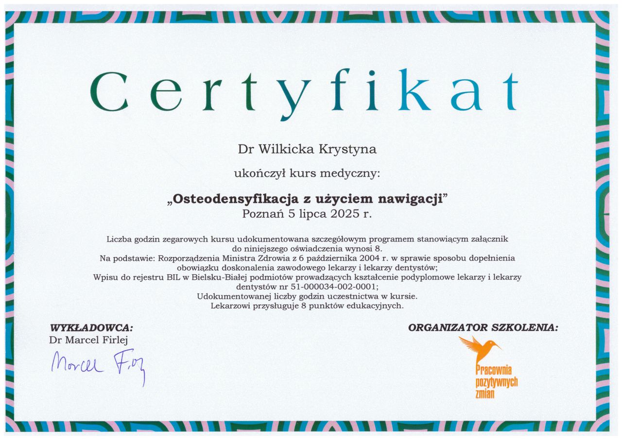 Jestem pod ogromnym wrażeniem jak profesjonalnie przebiegła wizyta! Każdy krok podczas zabiegu był na bieżąco komentowany i spokojnie wyjaśniany przez Panią Doktor, dzięki czemu czułam się bezpiecznie i komfortowo Usunięcie ósemki odbyło się sprawnie i bez zbędnego stresu, mimo że zazwyczaj bardzo się denerwuję przy podobnych zabiegach Po trzech tygodniach wszystko jest już prawie całkowicie zagojone.