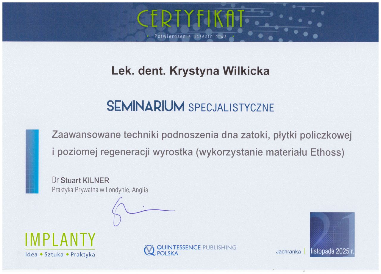 Jaki jest zakres porad oferowanych przez Krystyna Wilkicka?Krystyna Wilkicka to stomatolog. Na podstawie swojego doświadczenia i wykształcenia Krystyna Wilkicka oferuje usługi takie jak: Konsultacja stomatologiczna, konsultacja chirurga stomatologa, usunięcie zęba stałego, usunięcie zęba ósmego, usunięcie zęba jednokorzeniowego, Nacięcie ropnia, implanty, Konsultacja implantologiczna z planem leczenia.