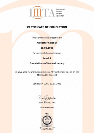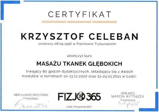 Jestem doświadczonym fizjoterapeutą w Łodzi, specjalizującym się w terapii manualnej oraz rehabilitacji kręgosłupa i stawów obwodowych (bark, łokieć, biodro, kolano). Ukończyłem Uniwersytet Medyczny w Łodzi. W pracy kieruję się zasadami Evidence-Based Medicine (EBM) oraz Evidence-Based Practice (EBP), dlatego szczególną uwagę przykładam do znalezienia przyczyny problemu. Kluczowe znaczenie ma dla mnie dokładny wywiad, ukierunkowana diagnostyka funkcjonalna oraz zaangażowanie pacjenta.