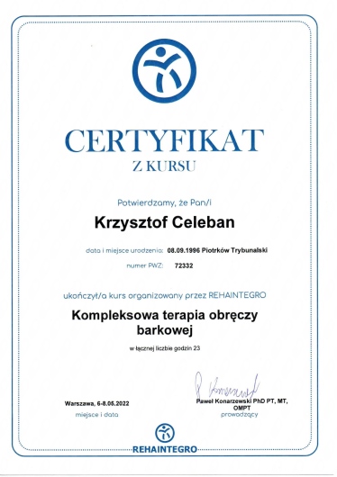 Jestem pełna uznania dla wiedzy i zaangażowania w terapii moich kolan. Uważam, że ustrzegę się operacji chirurgicznej. Polecam usługi mgra Krzysztofa Celebana