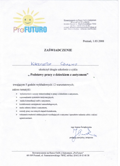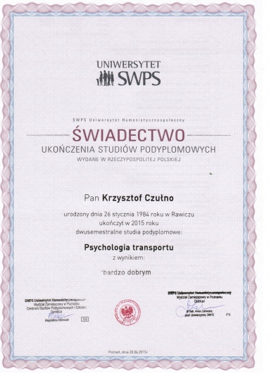 Jestem psychologiem, psychoterapeutą z prawie 18-letnim doświadczeniem zawodowym. Ukończyłem pięcioletnie, dzienne studia magisterskie z psychologii na Uniwersytecie A. Mickiewicza w Poznaniu oraz całościowy pięcioletni kurs z psychoterapii w Wielkopolskim Instytucie Psychoterapii w Poznaniu.