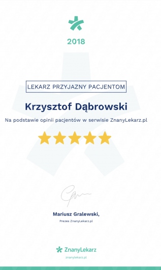 Jak Krzysztof Dąbrowski umawia wizyty?Krzysztof Dąbrowski używa kalendarza ZnanyLekarz, dlatego na stronie widzisz aktualne terminy. Wystarczy, że wybierzesz datę i godzinę, które odpowiadają Ci najbardziej. Umawianie wizyty jest darmowe, a tuż przed terminem wyślemy Ci przypomnienie.