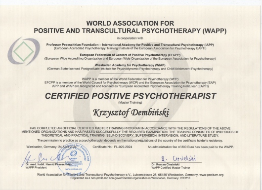 Jestem psychoterapeutą certyfikowanym w nurcie integracyjnym (numer certyfikacji: PL-029-2024). Ukończyłem pięcioletnie szkolenie z zakresu psychoterapii w nurcie psychoterapii pozytywnej (PPT). Swoją edukację kontynuuję, rozwijając się obecnie w nurcie ericksonowskim i systemowym.